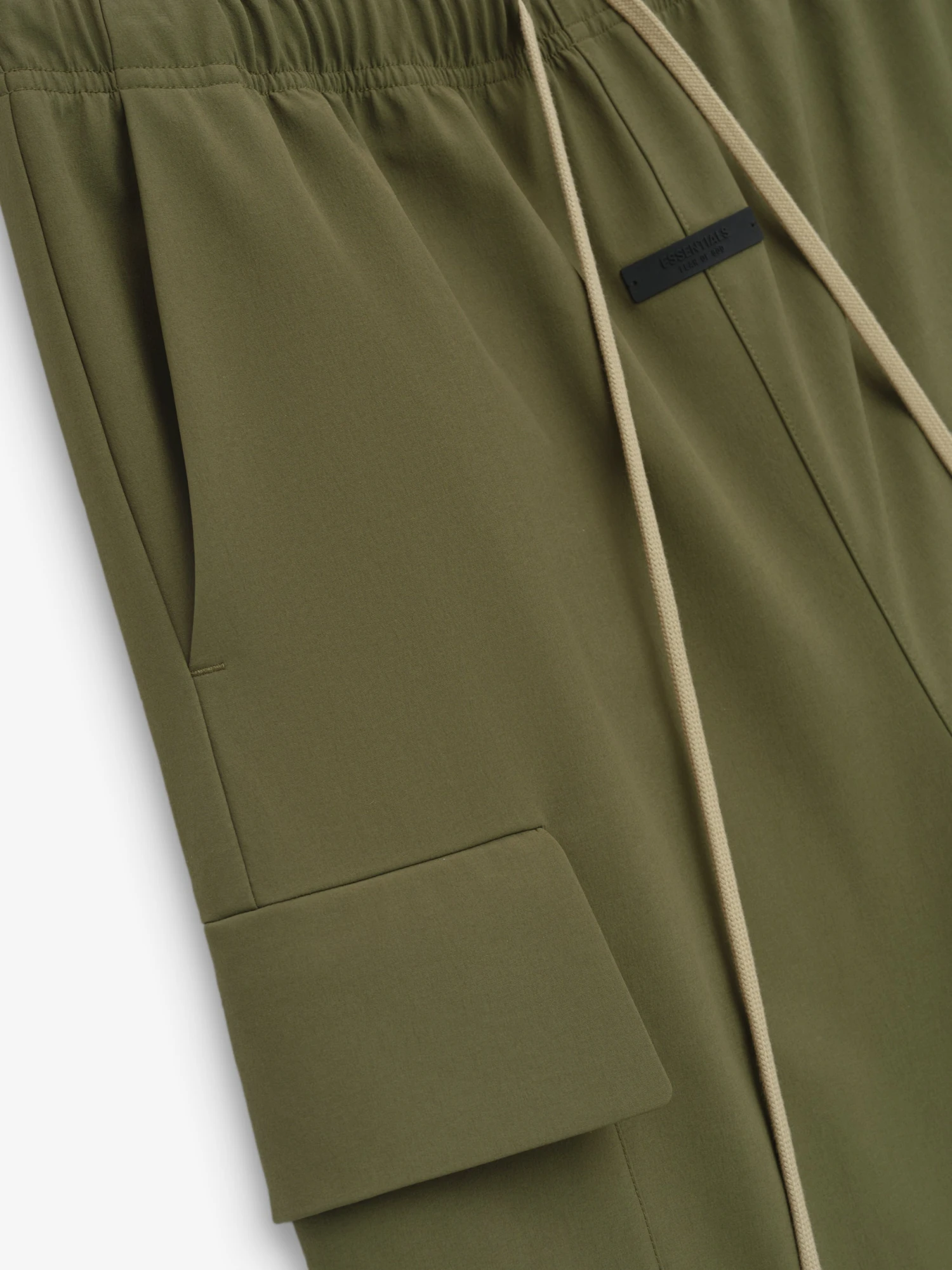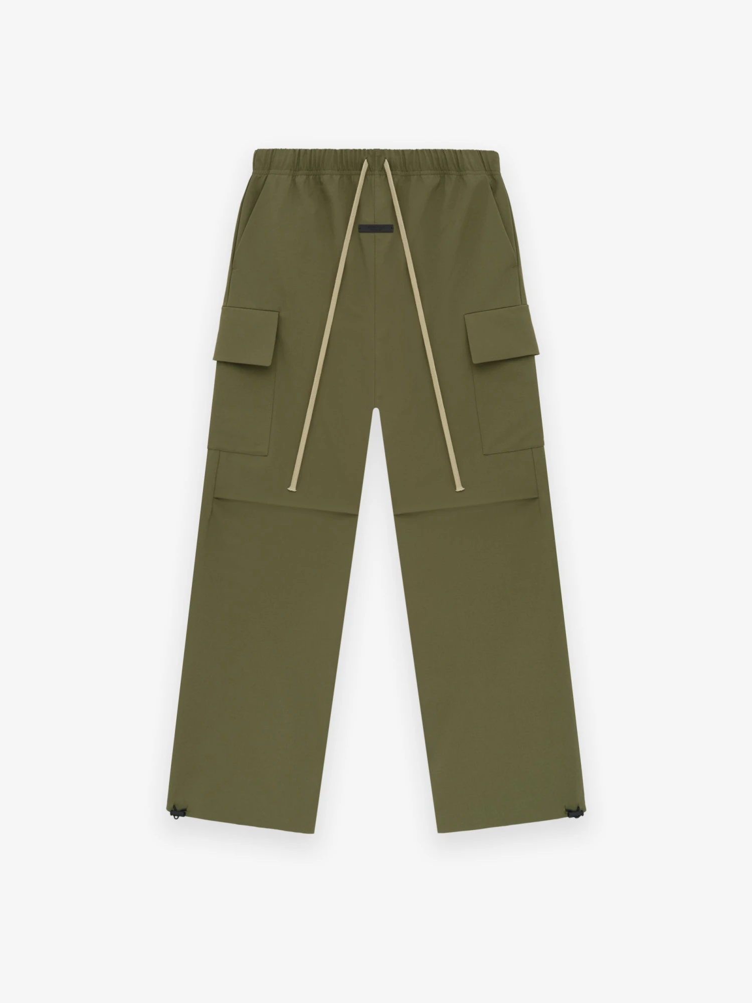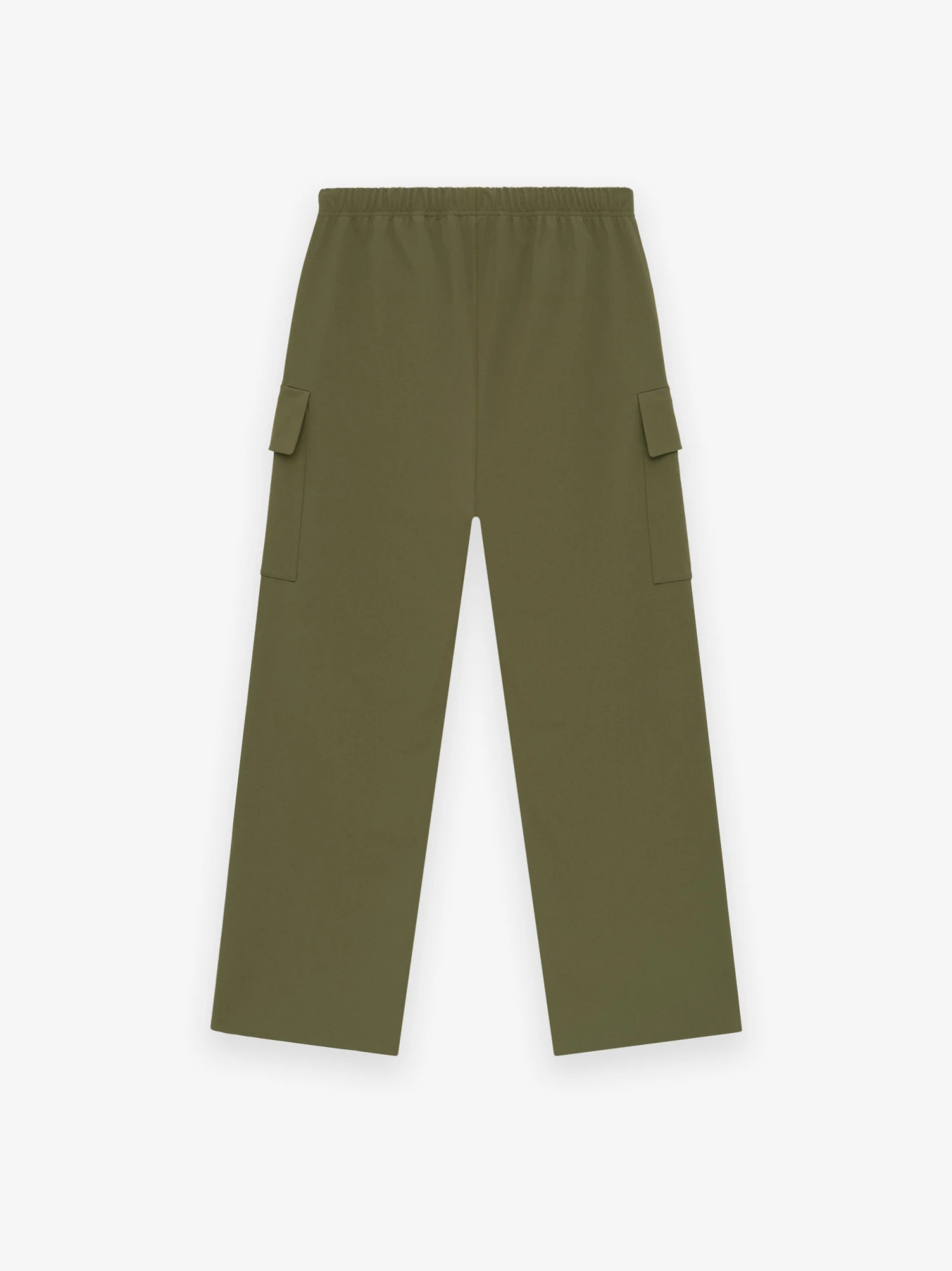 The Bonded Nylon Field Pant is made in double-layered stretch nylon for polished structure, and a full perforated poly lining for comfort. The wide leg fit pant has cargo pockets, encased elastic waistband, elongated drawstring, side pockets, and ankle bungee cord for adjustability. Minimalist branding is seen in the Essentials Fear of God black bar at center front.
