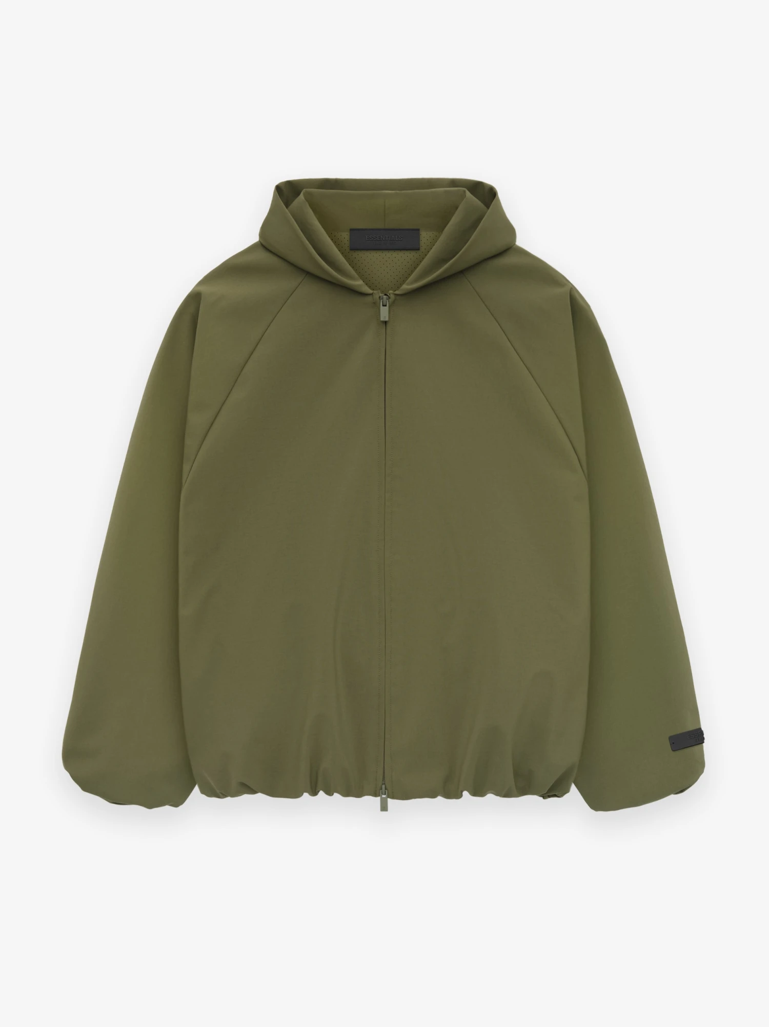 The Bonded Nylon Hooded Bomber is made in double-layered stretch nylon for polished structure, and a full perforated poly lining for comfort. The boxy, cropped hoodie style has a full front zip, side pockets, elastic cuffs and waist hem. The Essentials Fear of God black bar is stitched on the sleeve.