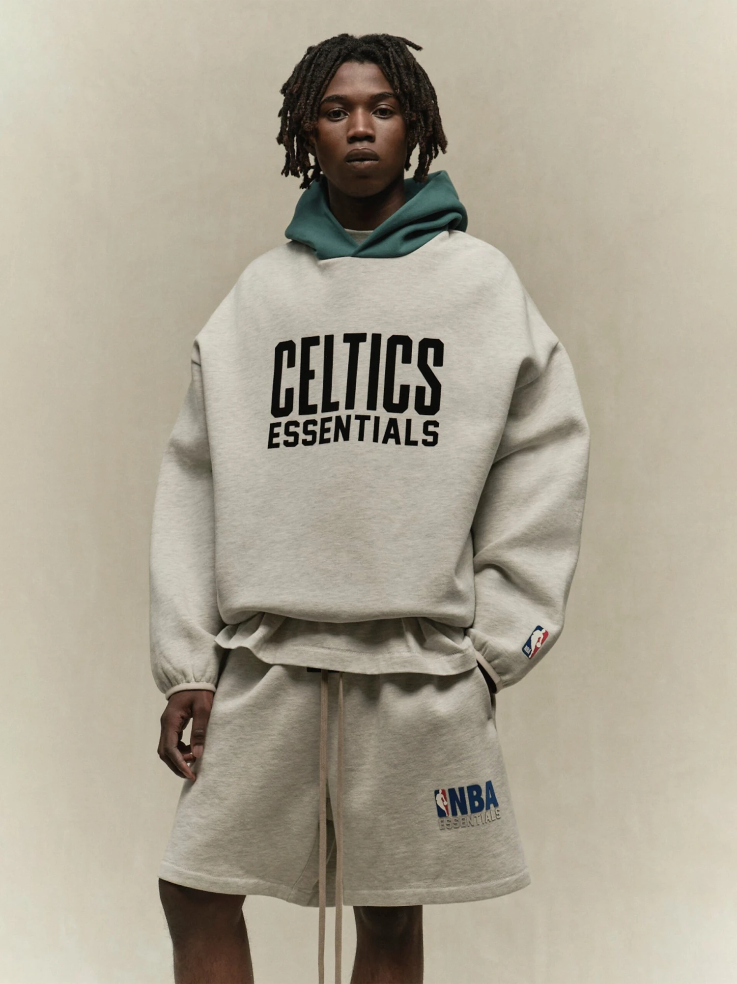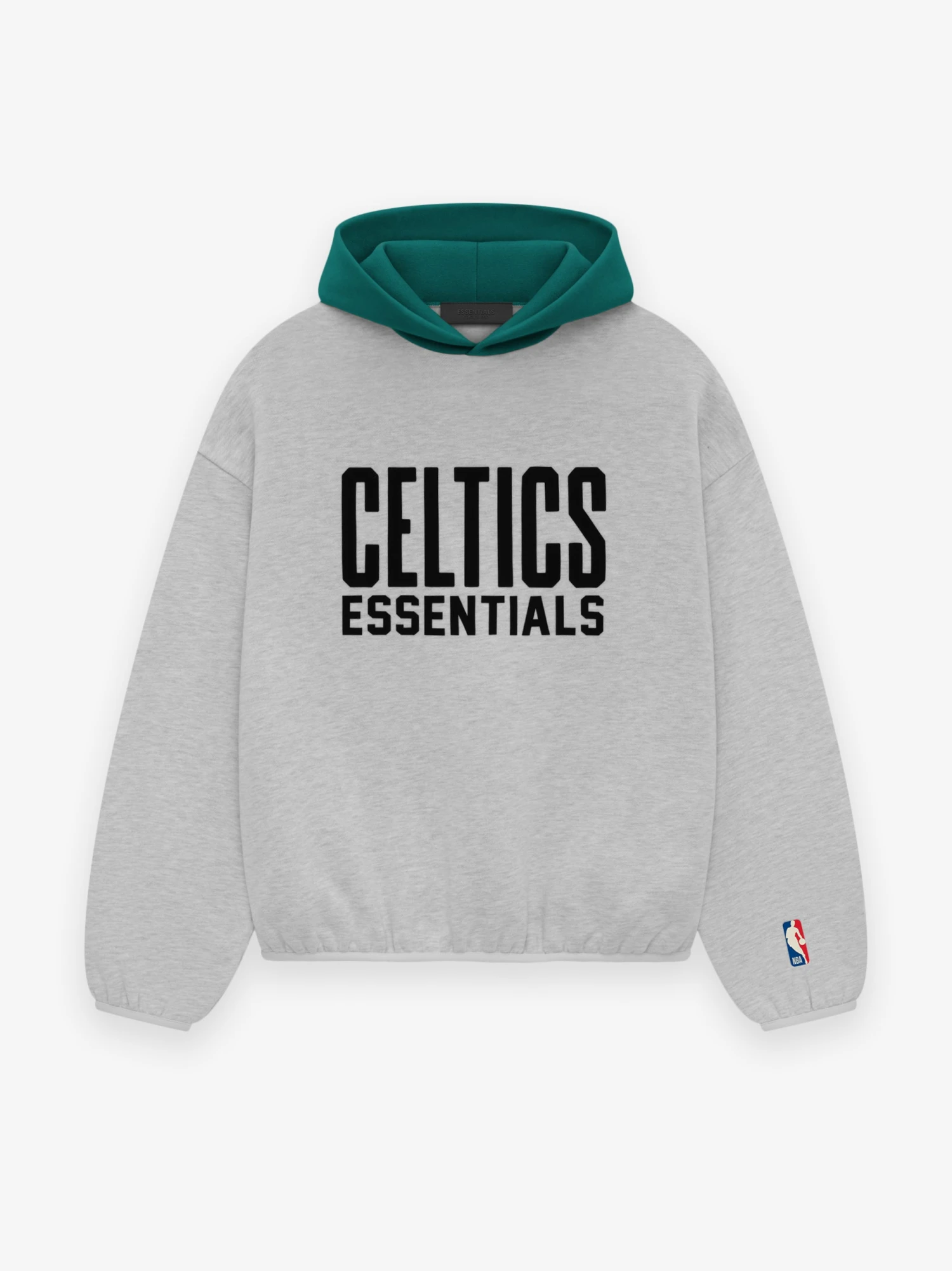 The Essentials Celtics hoodie is made from core fleece and showcases a trendy cropped silhouette. The front features a rubberized soft-touch “CELTICS ESSENTIALS” logo, along with the iconic NBA logo on the sleeve. Additional details include a contrasting double-layered hood, side seam pockets, and elastic bindings at the cuffs and hem. A rubberized “Essentials Fear of God” label is attached to the hood.