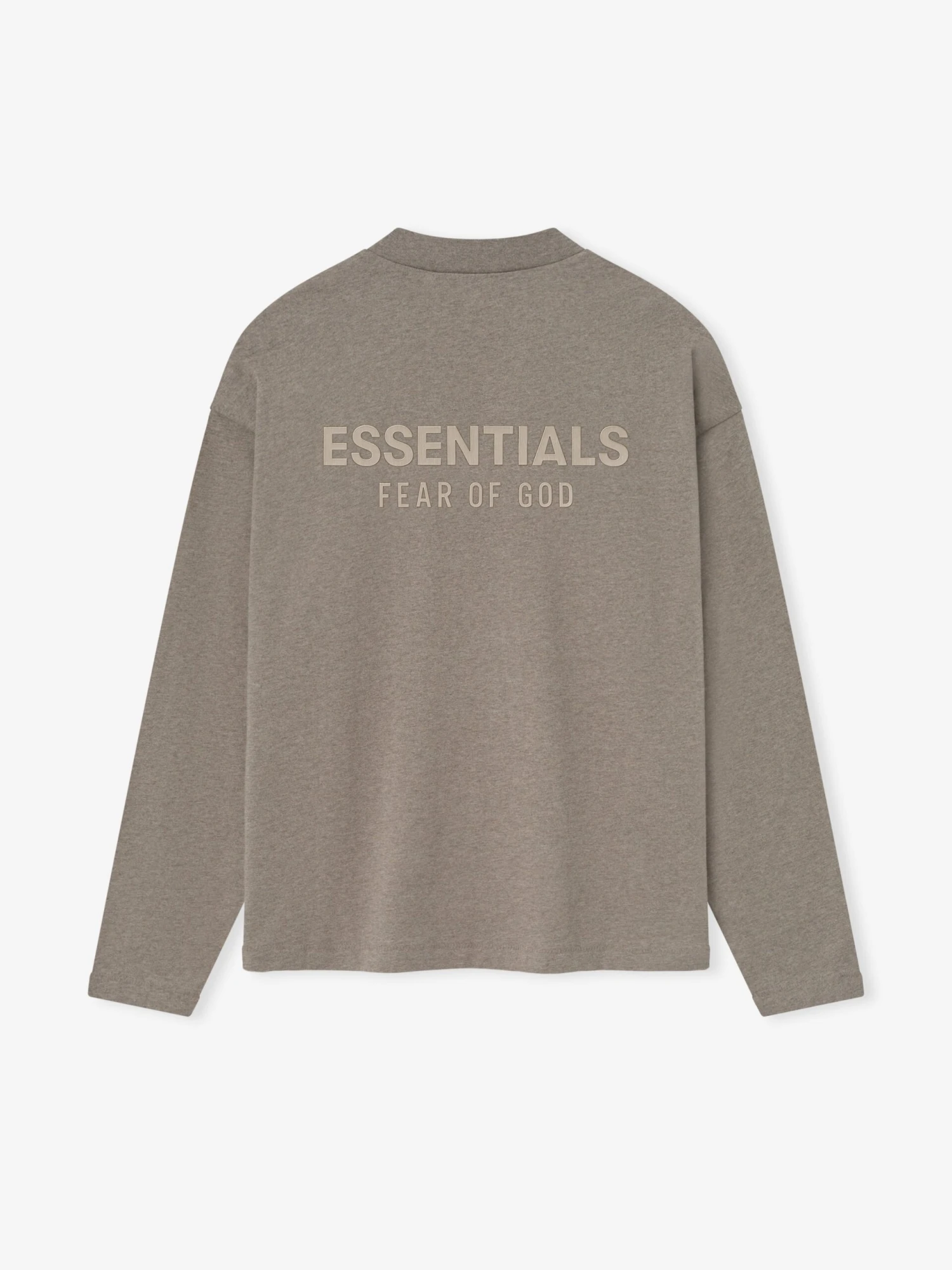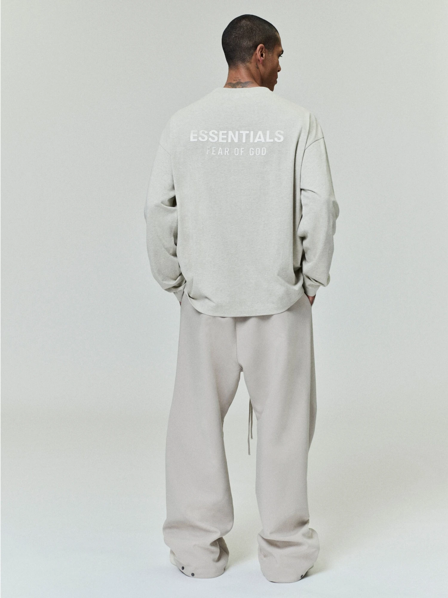The Classic Long Sleeve Tee is made from medium-weight 100% cotton jersey. The rib-knit crewneck tee features a classic fit with signature Fear of God relaxed proportions for everyday wear. Branding includes a “Fear of God Essentials” rubberized label at the center front and a new “Essentials Fear of God” beveled metallic logo across the back.