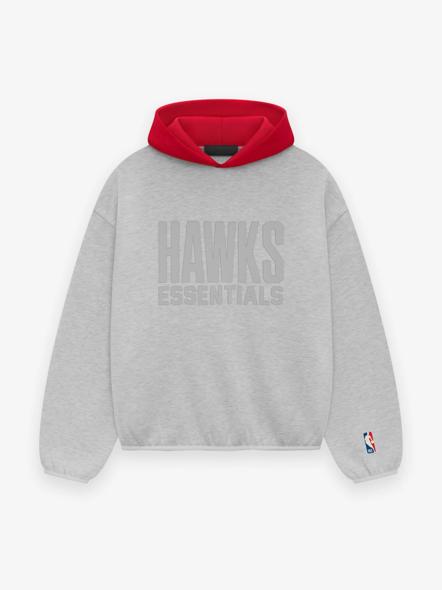The Essentials Hawks hoodie is crafted from core fleece and features a voluminous, cropped silhouette. The front displays a rubberized soft-touch Hawks Essentials lockup along with the iconic NBA logo on the sleeve. Additional details include a contrasting double layered hood, side seam pockets, and elastic bindings at the cuffs and waist hem. A rubberized Fear of God label is attached to the hood.