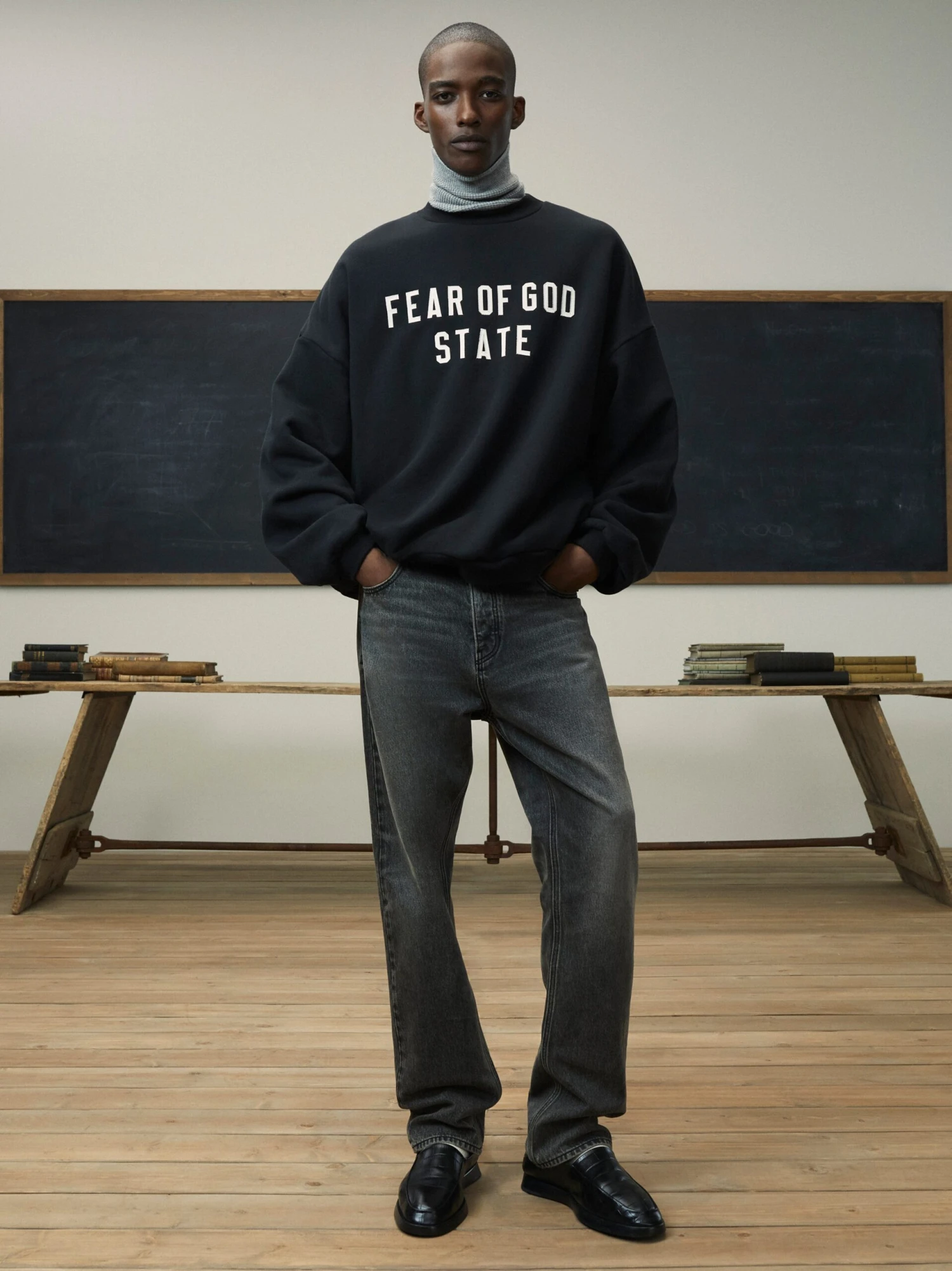 The Heavy Fleece Crewneck is made from heavyweight 520gsm, 100% cotton fleece with a subtle vintage wash. The designed volume creates a round, cropped silhouette. A collegiate-inspired “Fear of God State” satin twill varsity lettering is stitched across the front. Details include a rib-knit collar, cuffs, waist-hem, and side pockets. The Essentials Fear of God rubberized label is at the back collar.
