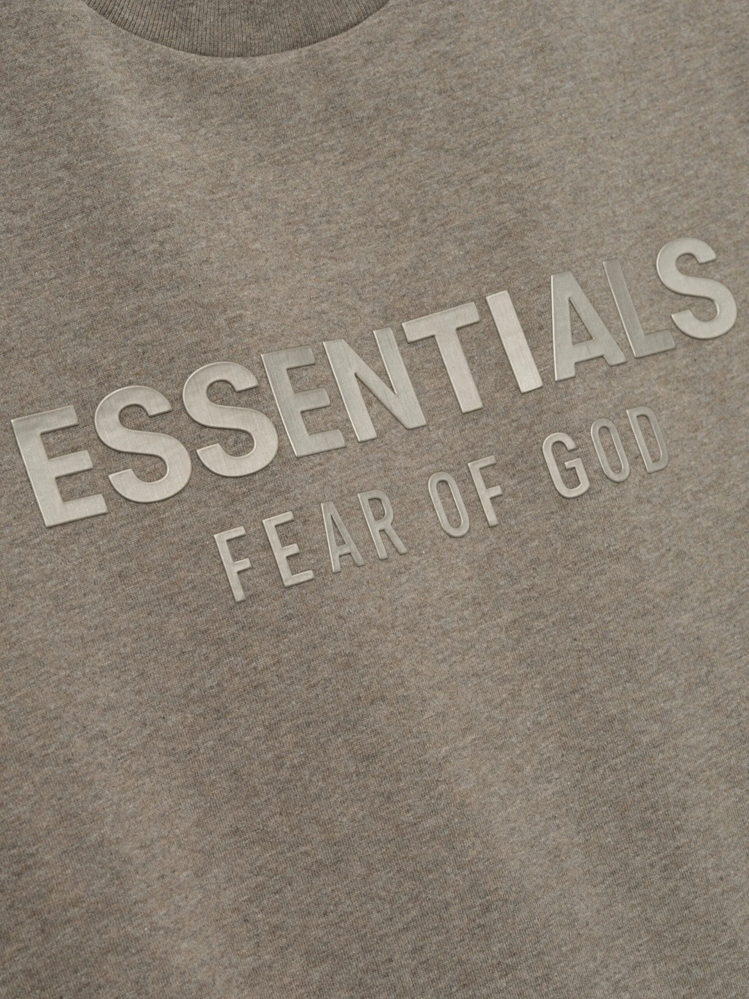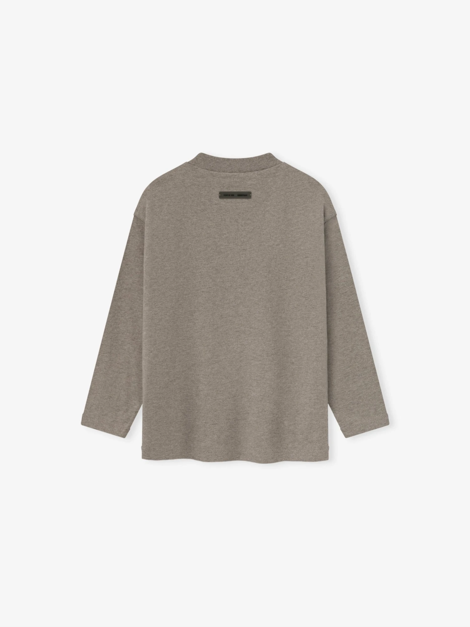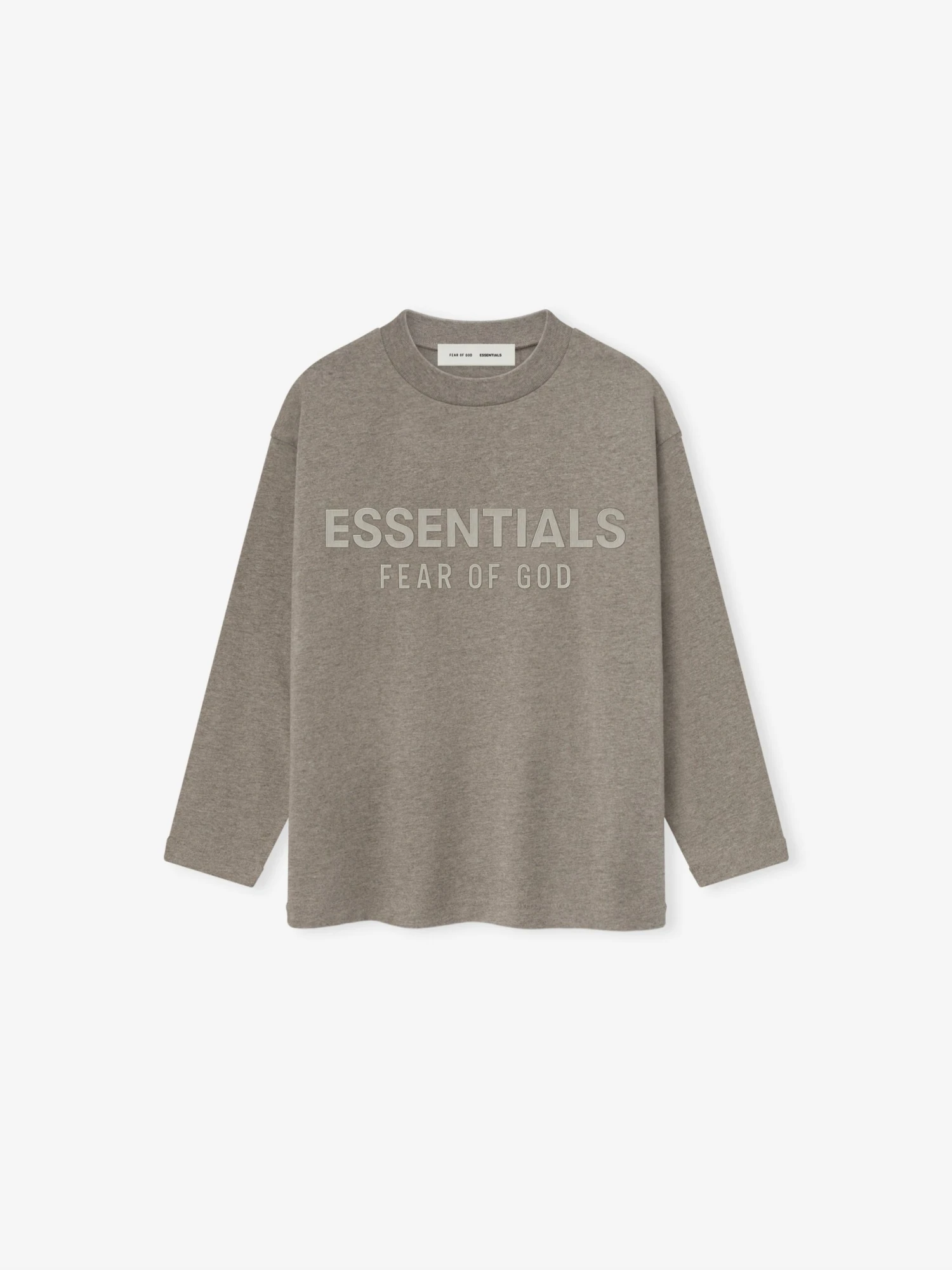 The Kids Classic Long Sleeve Tee is made from medium-weight 100% cotton jersey. The crewneck tee features a classic fit with signature relaxed proportions. Branding includes a new “Essentials Fear of God” beveled metallic logo on the front and a “Fear of God Essentials” rubberized label at the back collar.