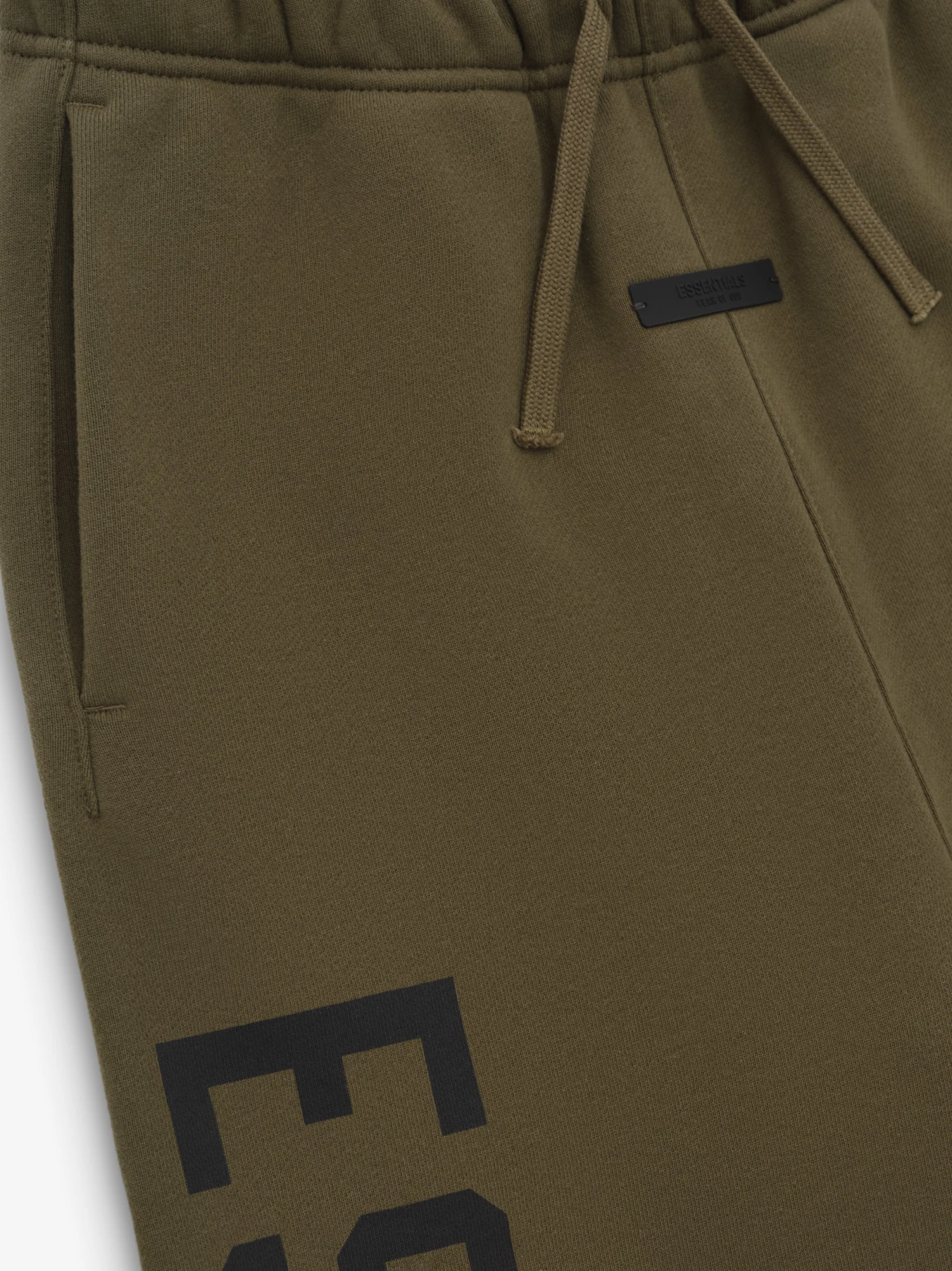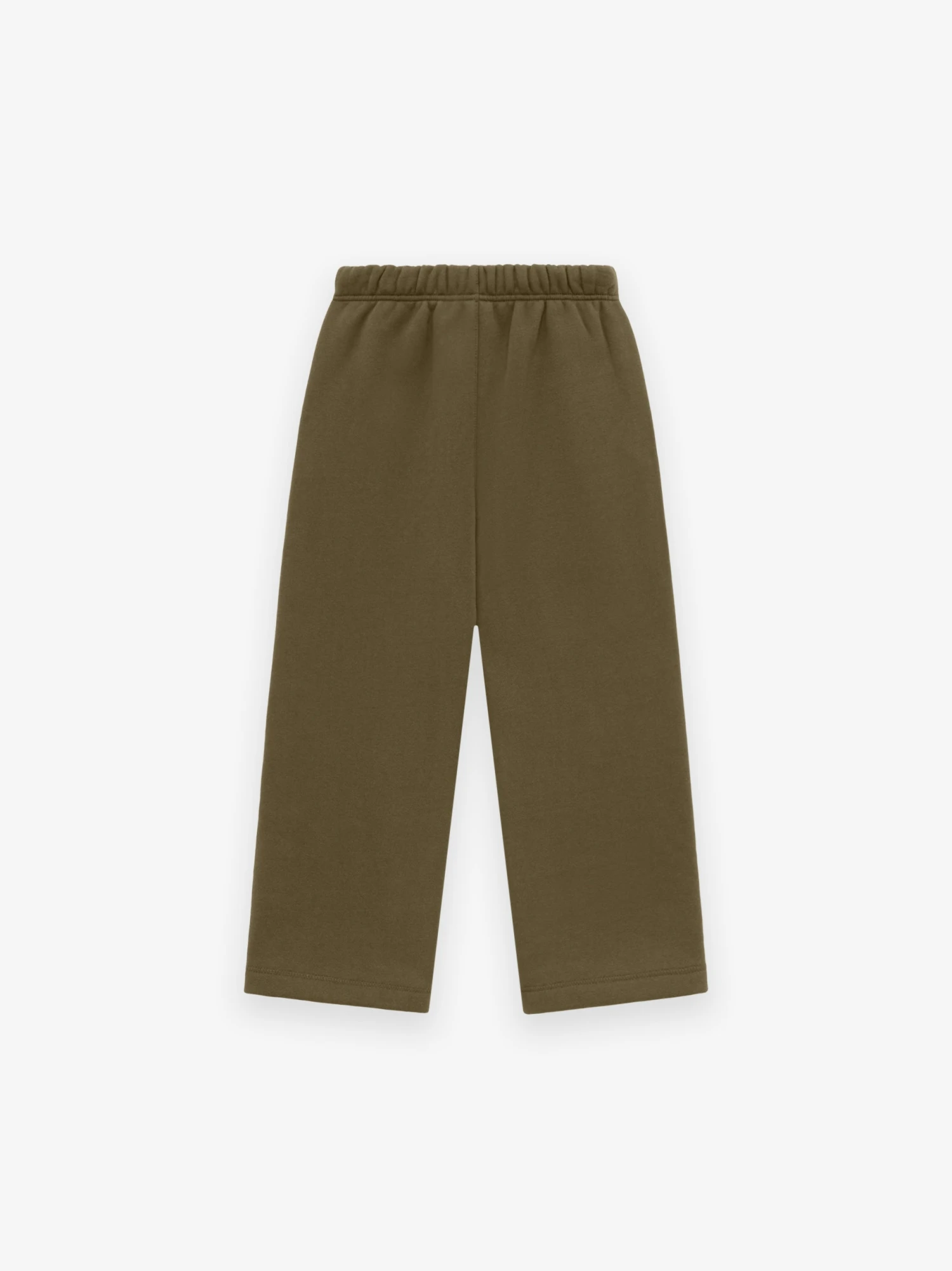 The Kids Relaxed Sweatpant has been upgraded with a heavy 480gsm core fleece to give extra body and structure to its wide leg design. A bold “Essentials” graphic is screen-printed down the length of the leg. Additional details include an encased elastic waistband with elongated drawstrings, and side seam pockets. The Essentials Fear of God rubberized label is at the center front.