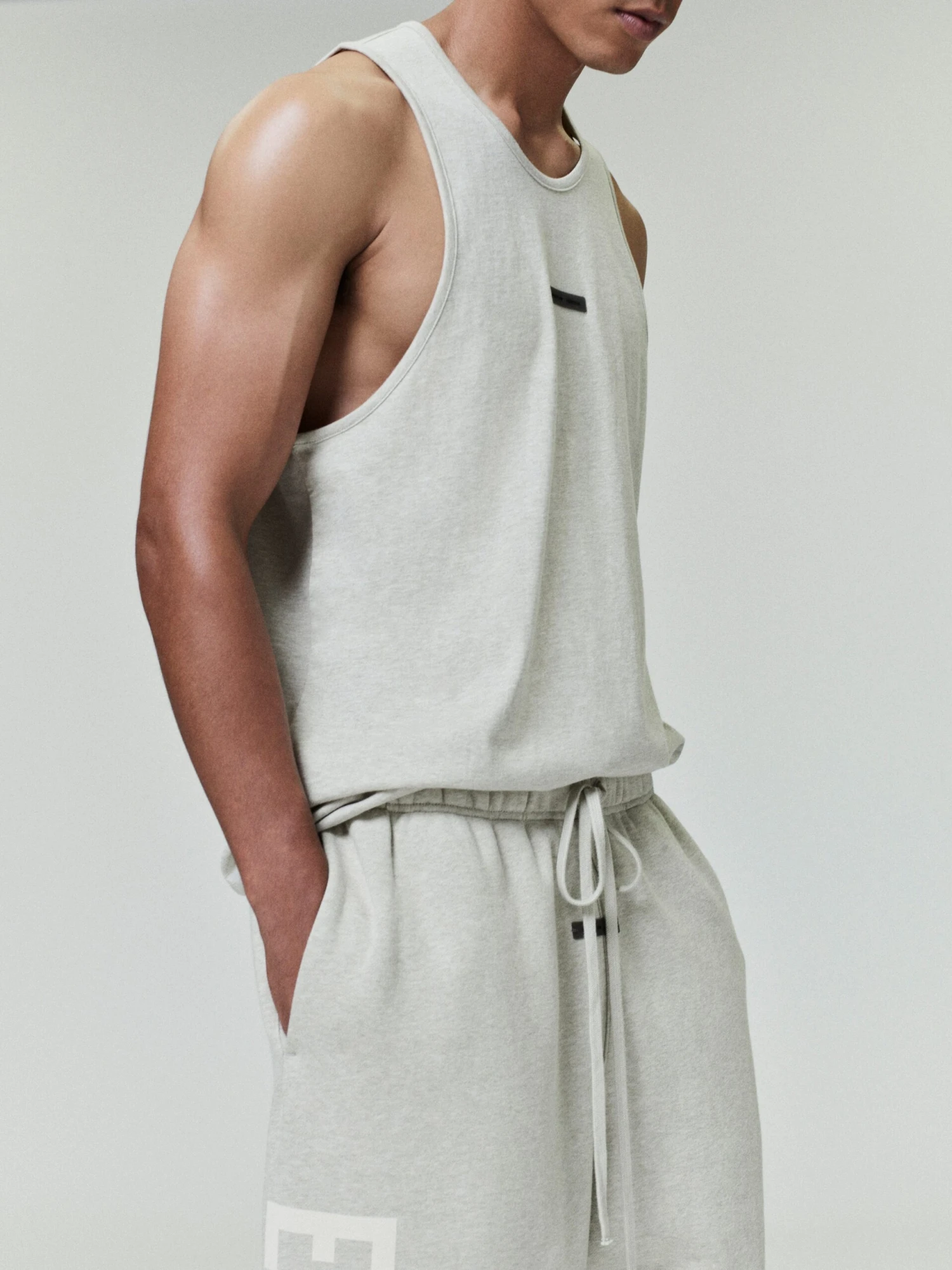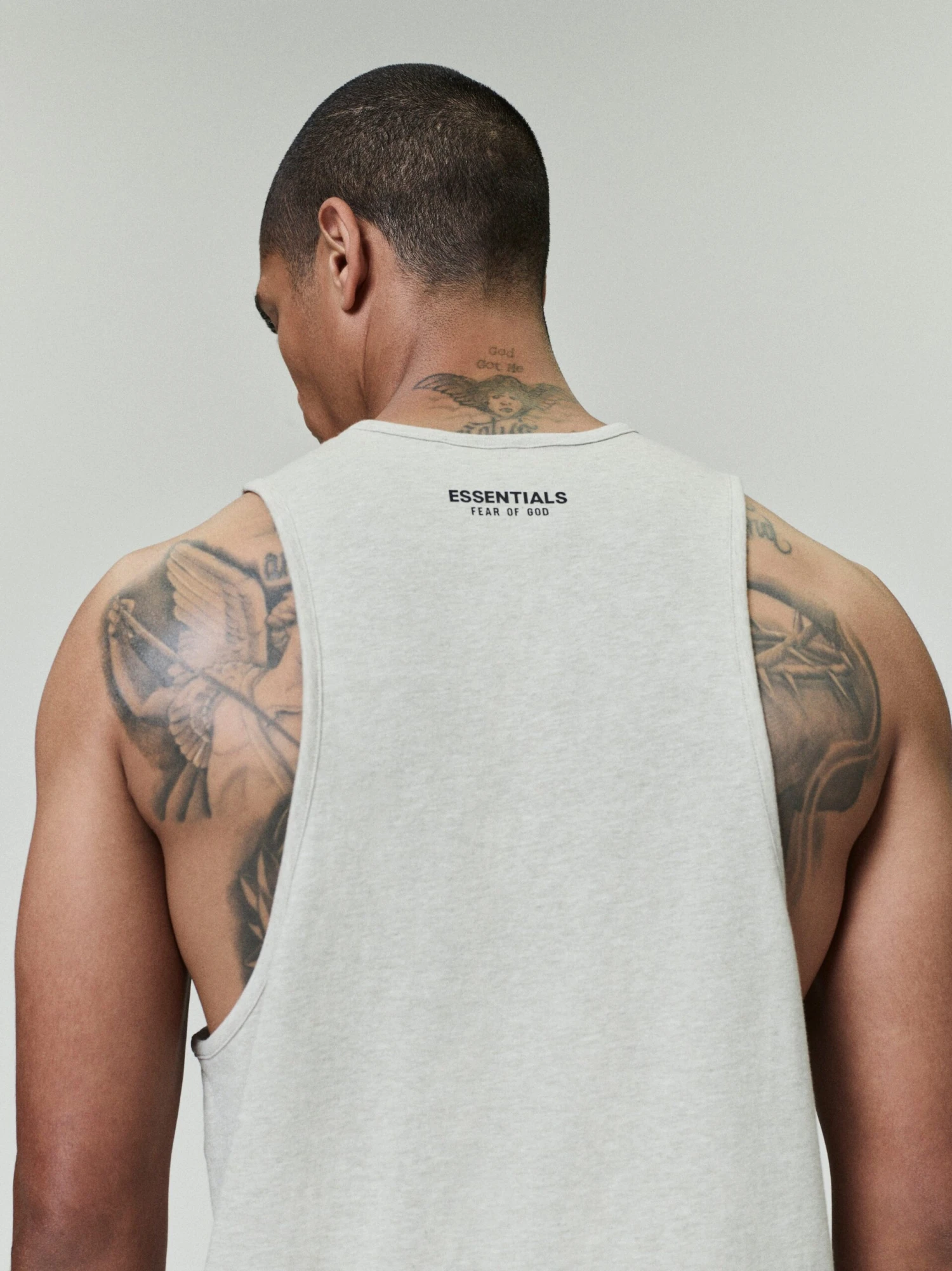 The Lightweight Essential Tank is crafted from lightweight 100% cotton jersey. The U-neck tank features a vintage fit for a slimmer silhouette with longer length. Branding includes a “Fear of God Essentials” rubberized label at the center front and the “Essentials Fear of God” logo at the back collar.