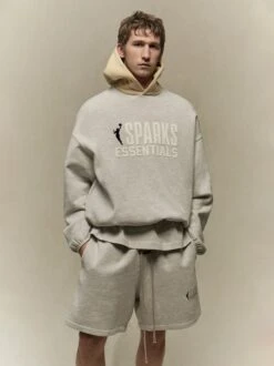 The Essentials Sparks hoodie is made from core fleece and boasts a voluminous, cropped silhouette. The front features a rubberized, soft-touch WNBA logo alongside the “SPARKS ESSENTIALS” lockup. Additional details include a contrasting double-layered hood, side seam pockets, and elastic bindings at the cuffs and waist hem. A rubberized “Essentials Fear of God” label is attached to the hood, while a WNBA logo is located on the back collar, underneath the hood.