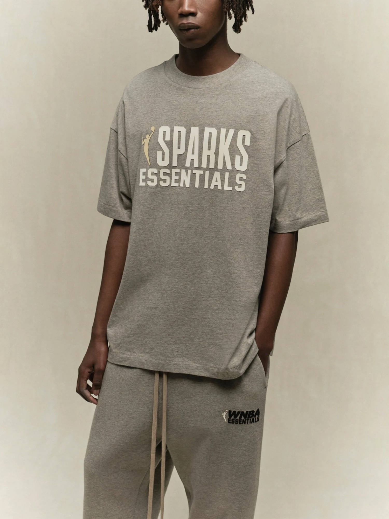 The Essentials Sparks short sleeve tee is crafted from core cotton jersey. It features a relaxed fit in the body with dropped shoulders and a rib-knit crewneck. On the front, there is a rubberized soft-touch “SPARKS ESSENTIALS” lockup, along with the WNBA logo. Additionally, a rubberized “Essentials Fear of God” label is located at the back collar.