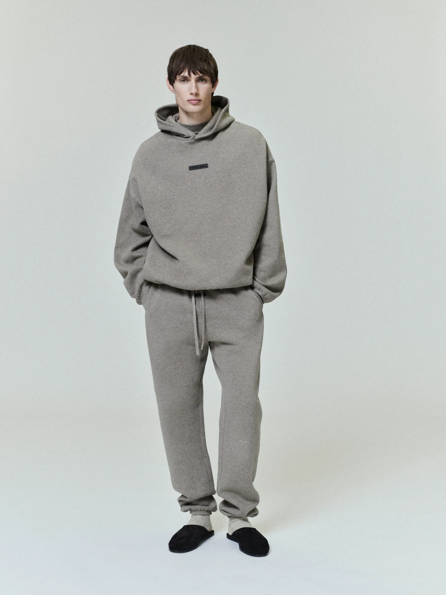 The Vintage Sweatpant is crafted from 380gsm core fleece, offering both body and structure. The vintage fit has a streamlined slim leg that resembles the original Essentials silhouettes. A new “Essentials Fear of God” beveled metallic logo is prominently branded on the leg. Additional details include an encased elastic waistband and bottom hem, elongated drawstrings, and side seam pockets. The front center showcases a the “Fear of God Essentials” rubberized label.