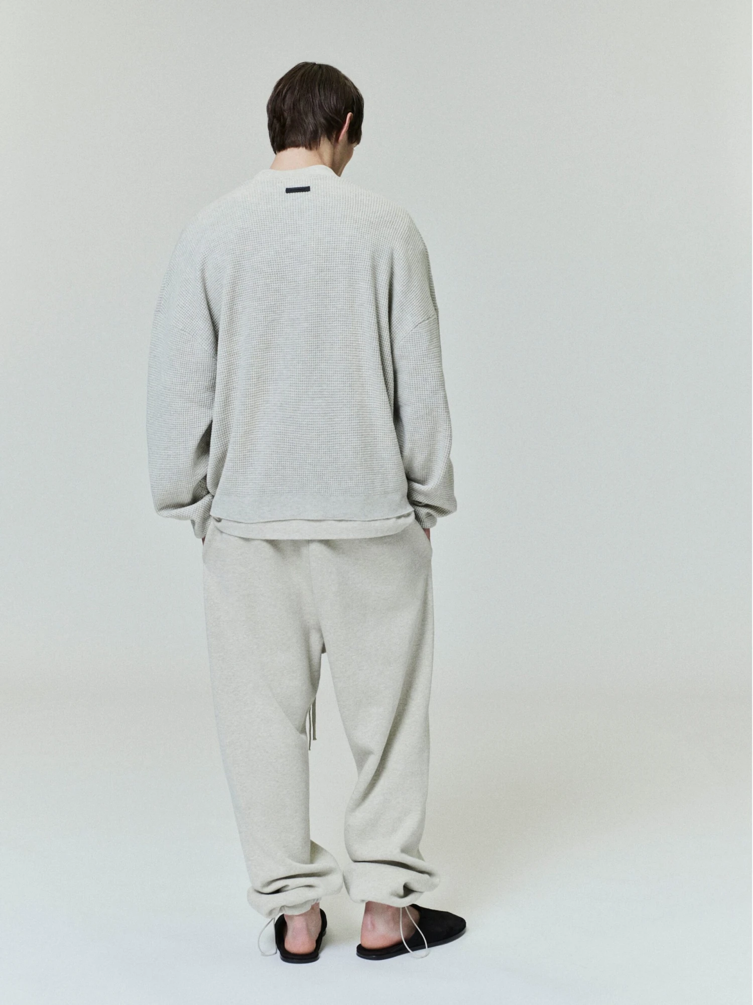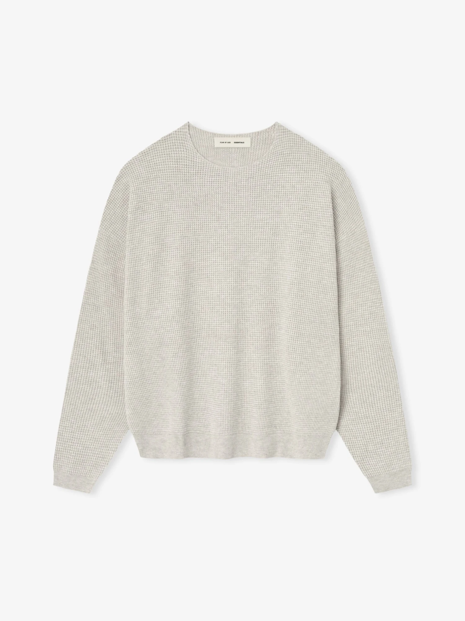 The Waffle Crewneck Sweater is made from heavyweight poly-nylon knit for warmth and stretch comfort. The fit is relaxed with drop shoulders, rib knit cuffs and waist hem. A “Fear of God Essentials” rubberized label is stitched at the back collar.