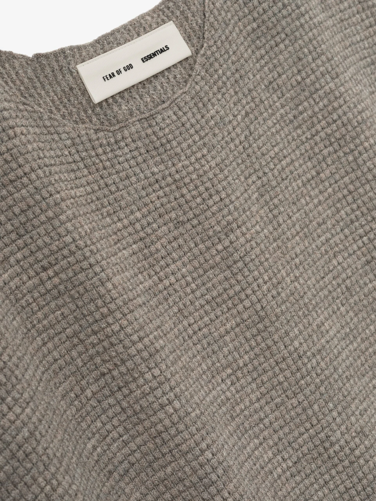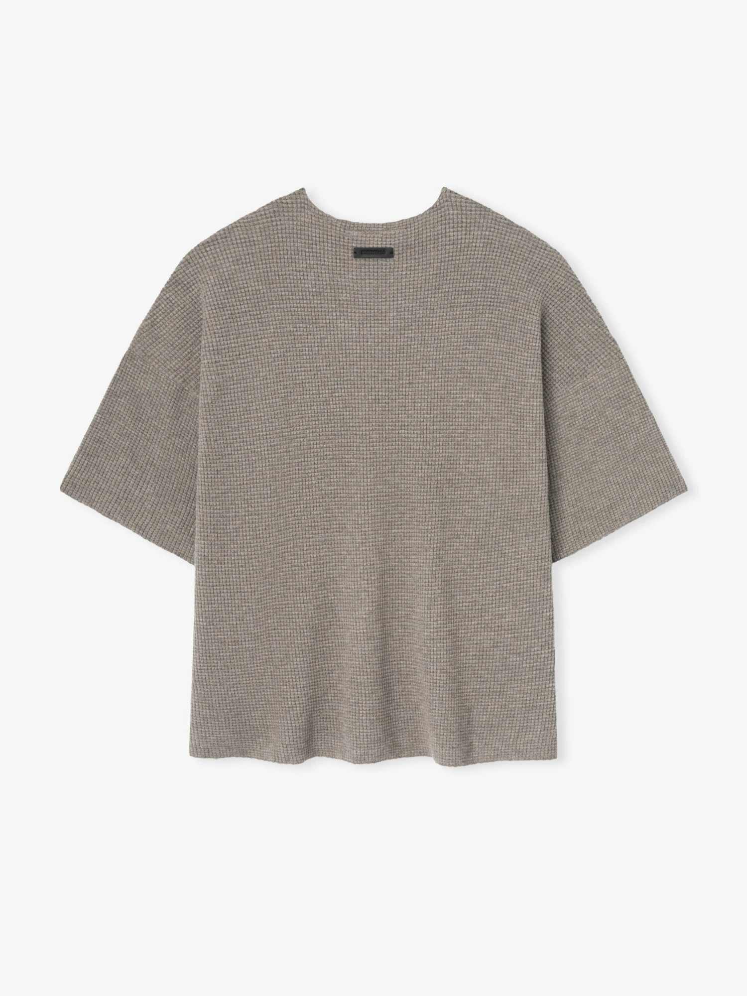 The Waffle Short Sleeve Sweater is made from heavyweight poly-nylon knit for warmth with stretch comfort. The fit is relaxed with drop shoulders. A “Fear of God Essentials” rubberized label is stitched at the back collar.