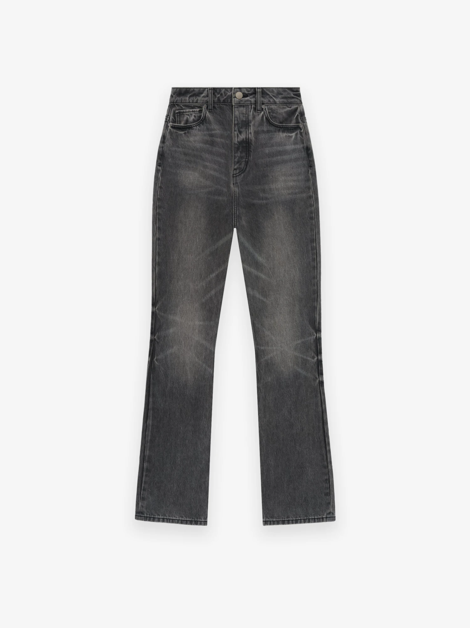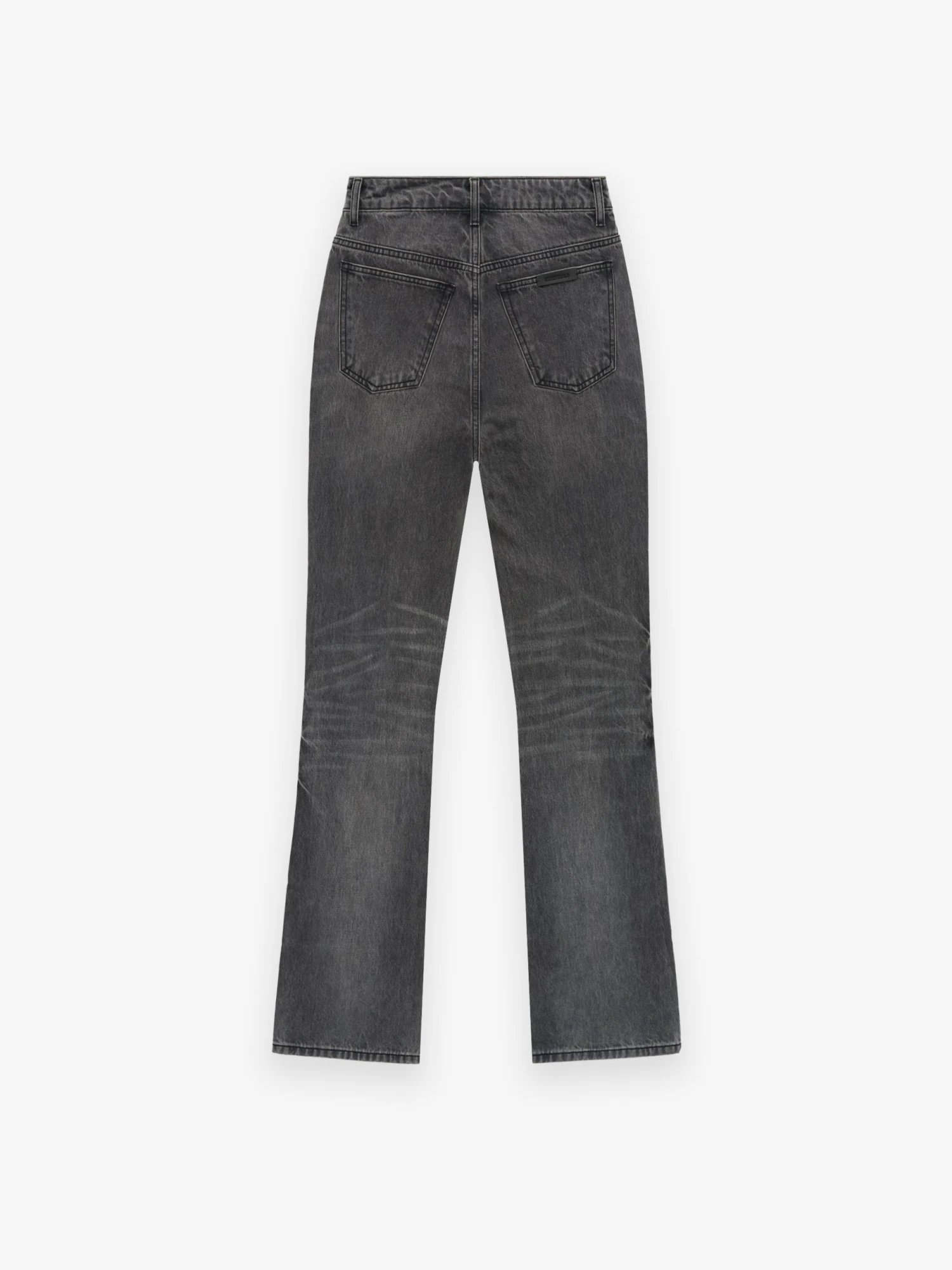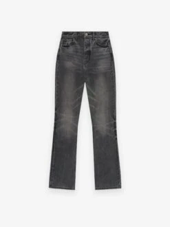 The Women’s High Waisted Fitted Jean is made of 100% cotton in a vintage black wash. The high waisted style has a slim leg and is detailed with antique brass hardware, and the Essentials Fear of God black bar.