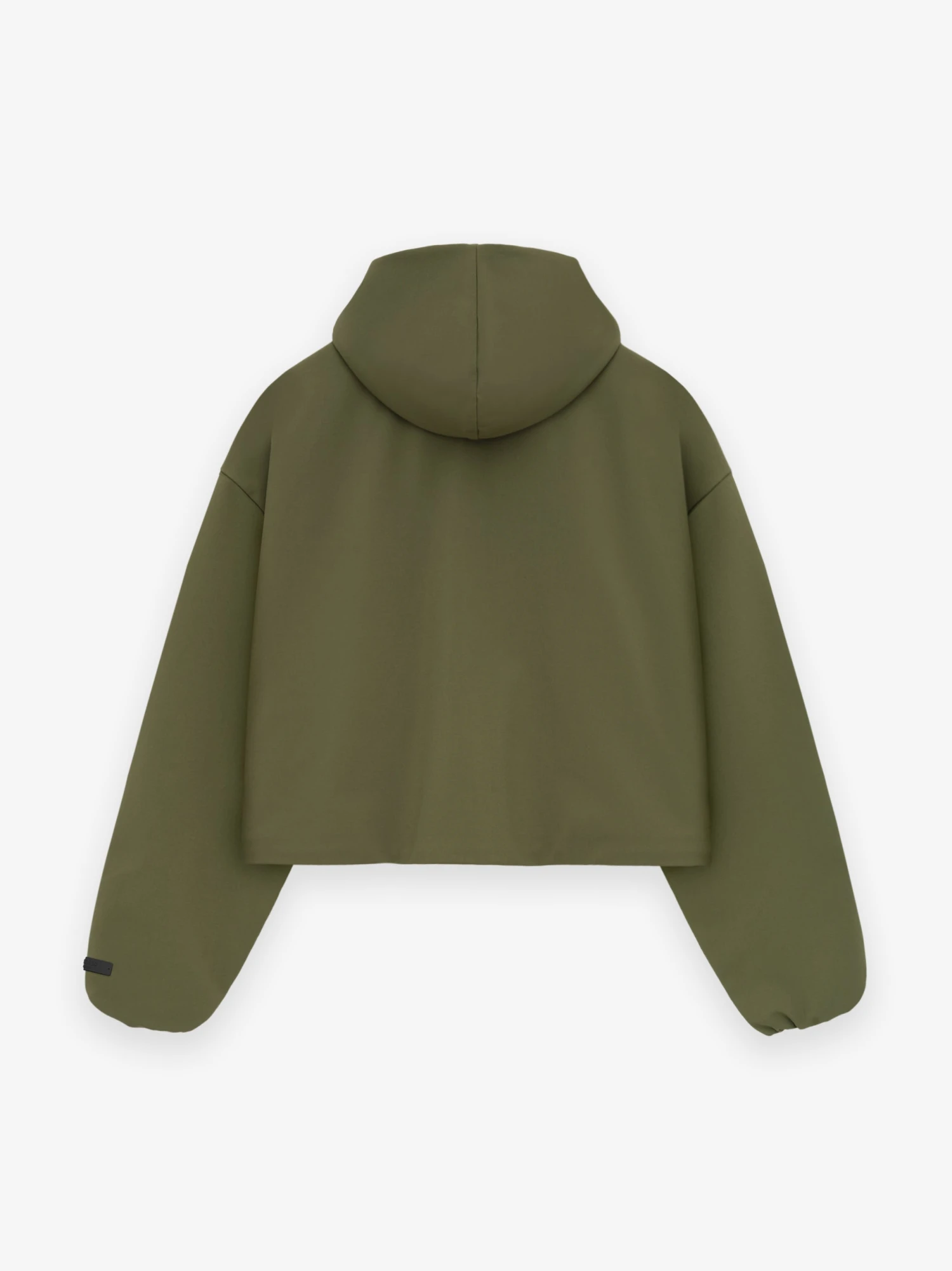The Womens Bonded Nylon Hooded Anorak is made of double-layered stretch nylon for polished structure and a full perforated poly lining for comfort. The hoodie has a cropped, rounded style with full front zip, flap pockets, elastic cuffs and waist hem. The Essentials Fear of God black bar is stitched on the sleeve.