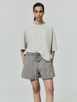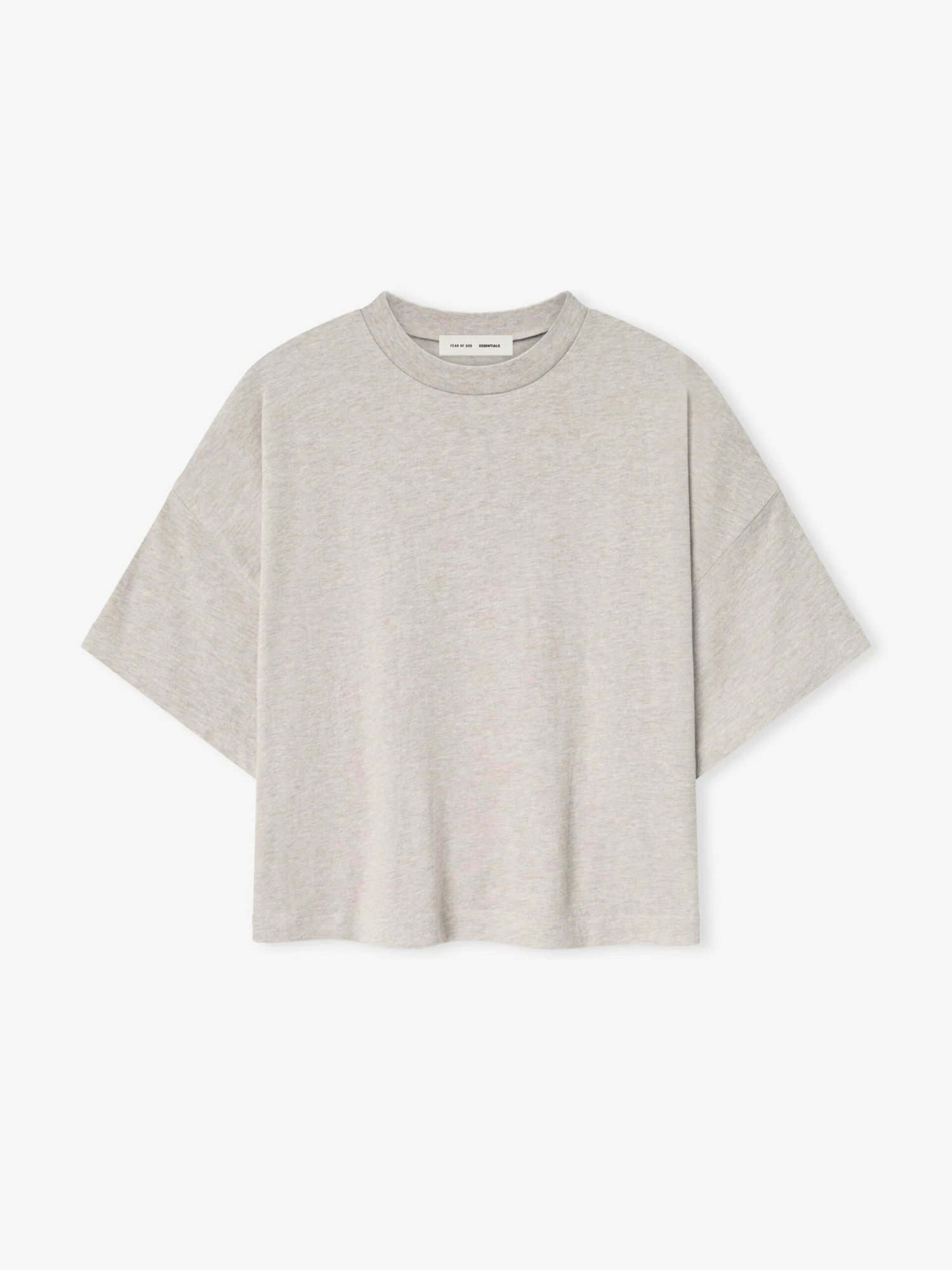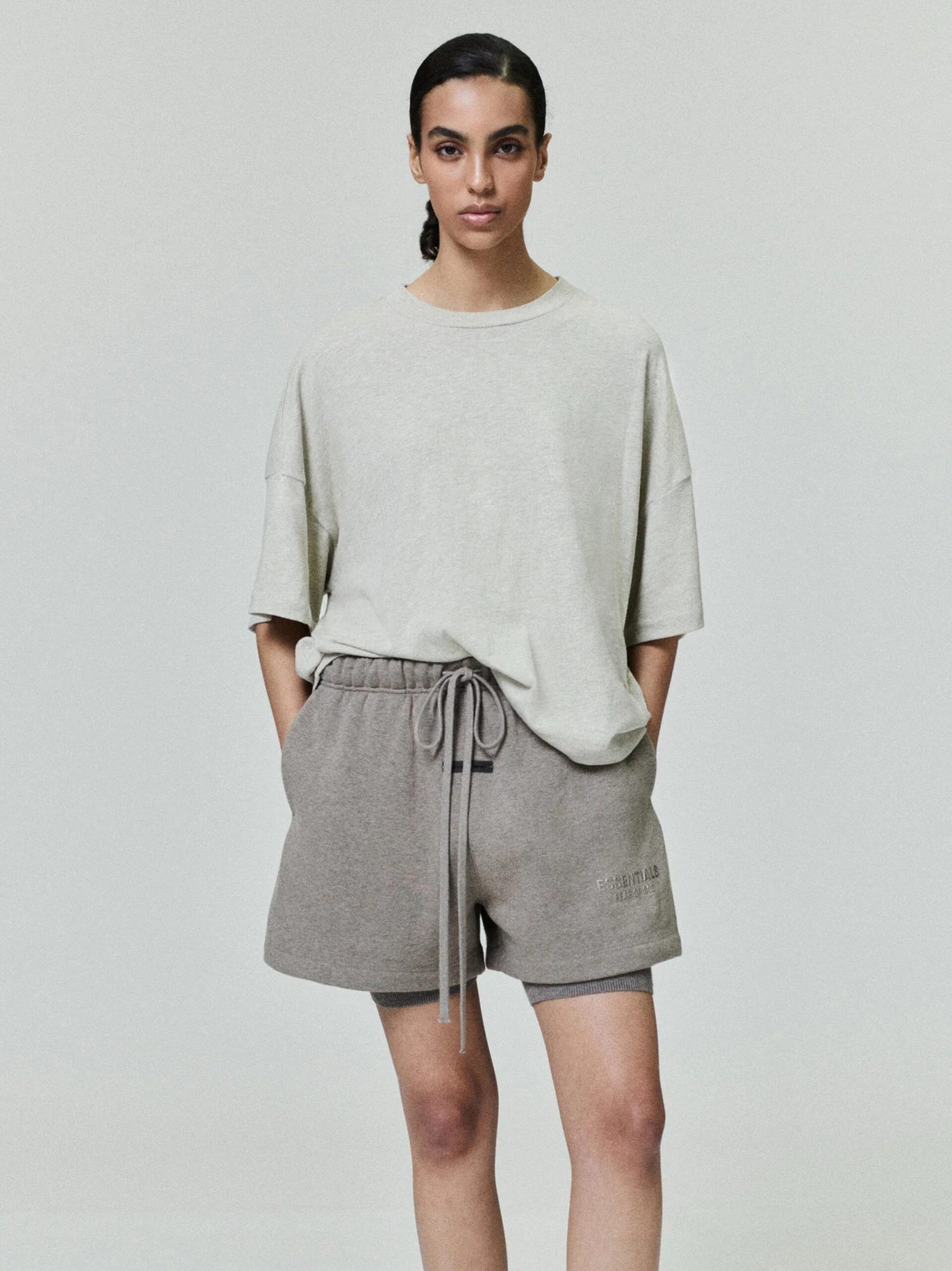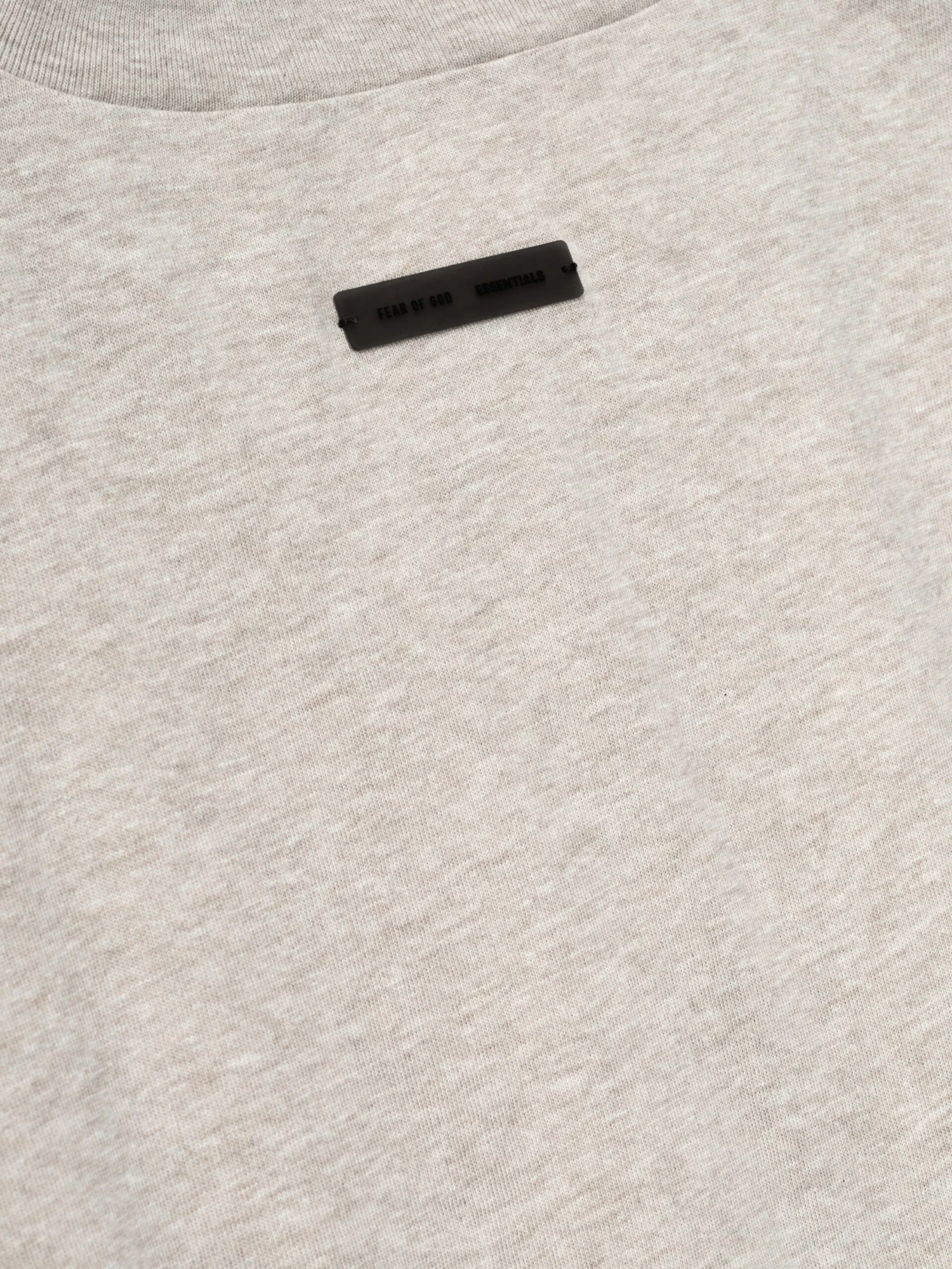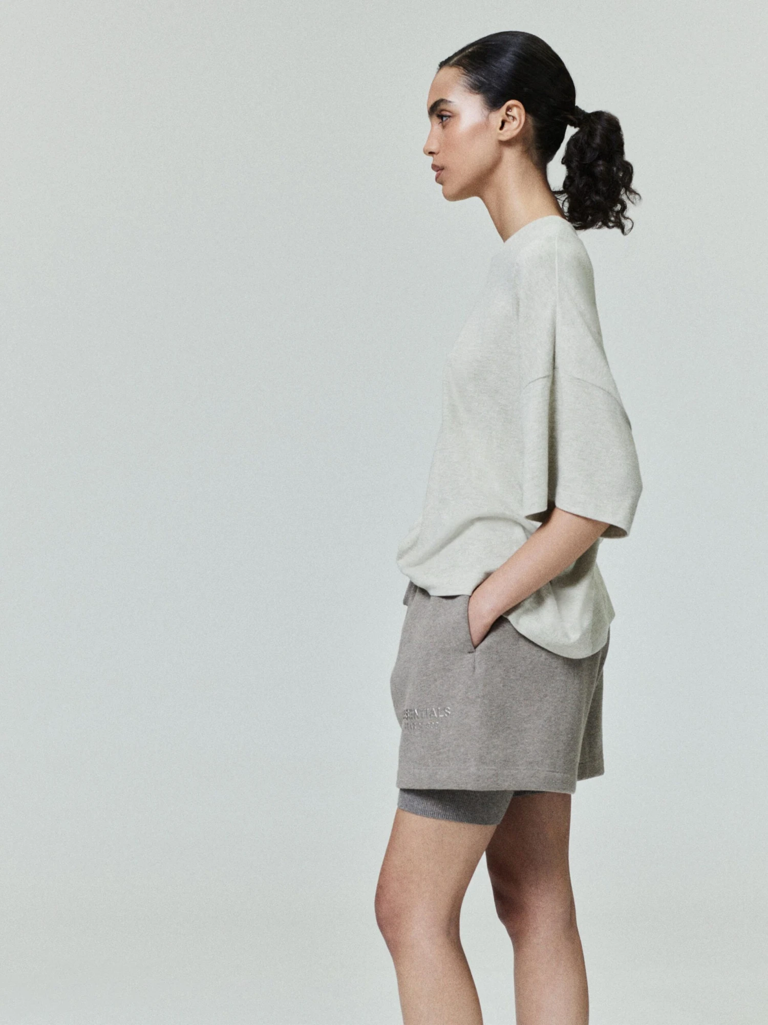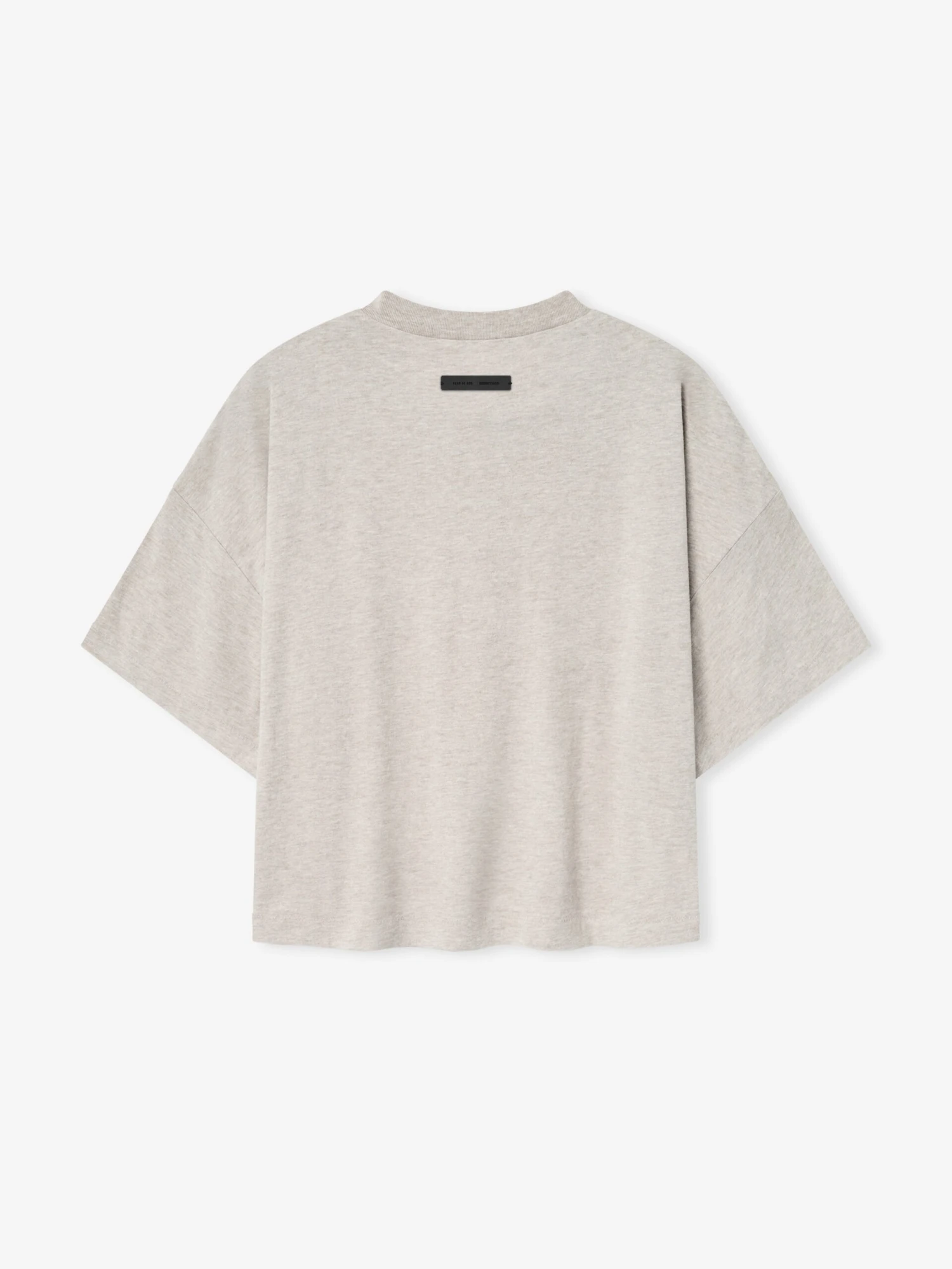 The Womens Boxy Tee is made of a tri-blend jersey for a softer feel. The rib-knit crewneck tee features a loose fit in the body with drop shoulders for stylized drape. The branding is minimalist, showcasing a “Fear of God Essentials” rubberized label at the collar.