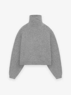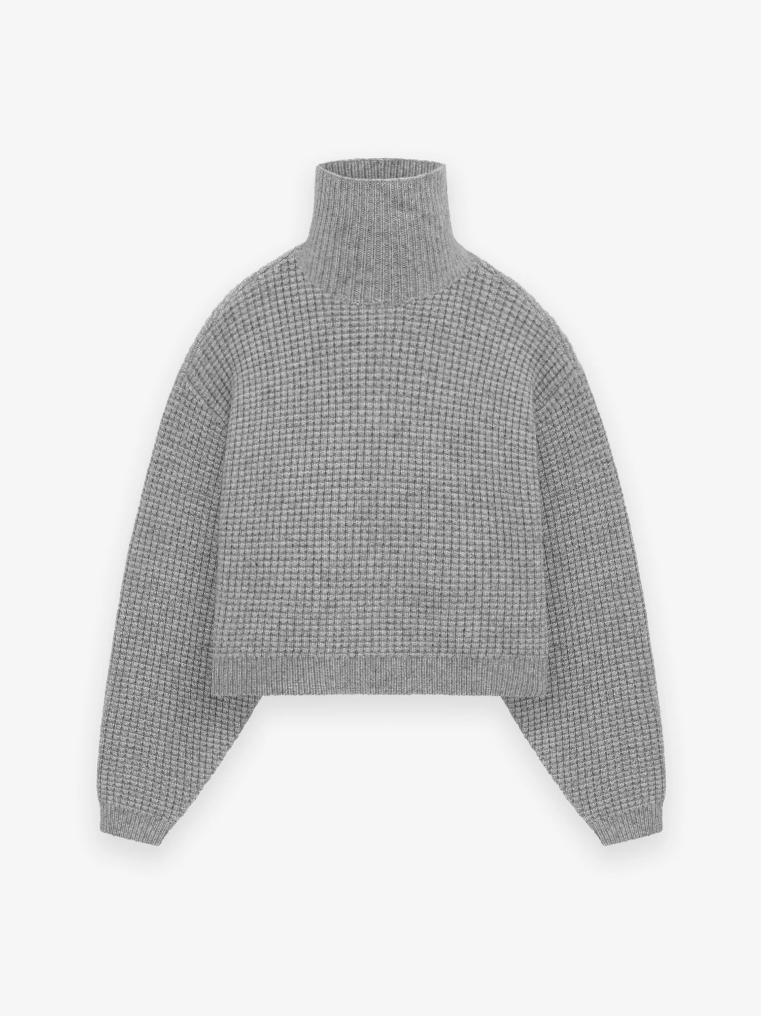 The Womens Heavy Waffle Turtleneck is crafted from a heavyweight poly-nylon knit, providing warmth, comfort, and rich texture. The turtleneck features a cropped, rounded fit with rib-knit cuffs, and waist hem. The Essentials Fear of God rubberized label is stitched at the back of the collar.