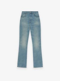 The Womens High Waisted Fitted Jean is made of 100% cotton denim in a vintage blue wash. The high waisted style has a slim leg and is detailed with antique brass hardware, and the Essentials Fear of God black bar.