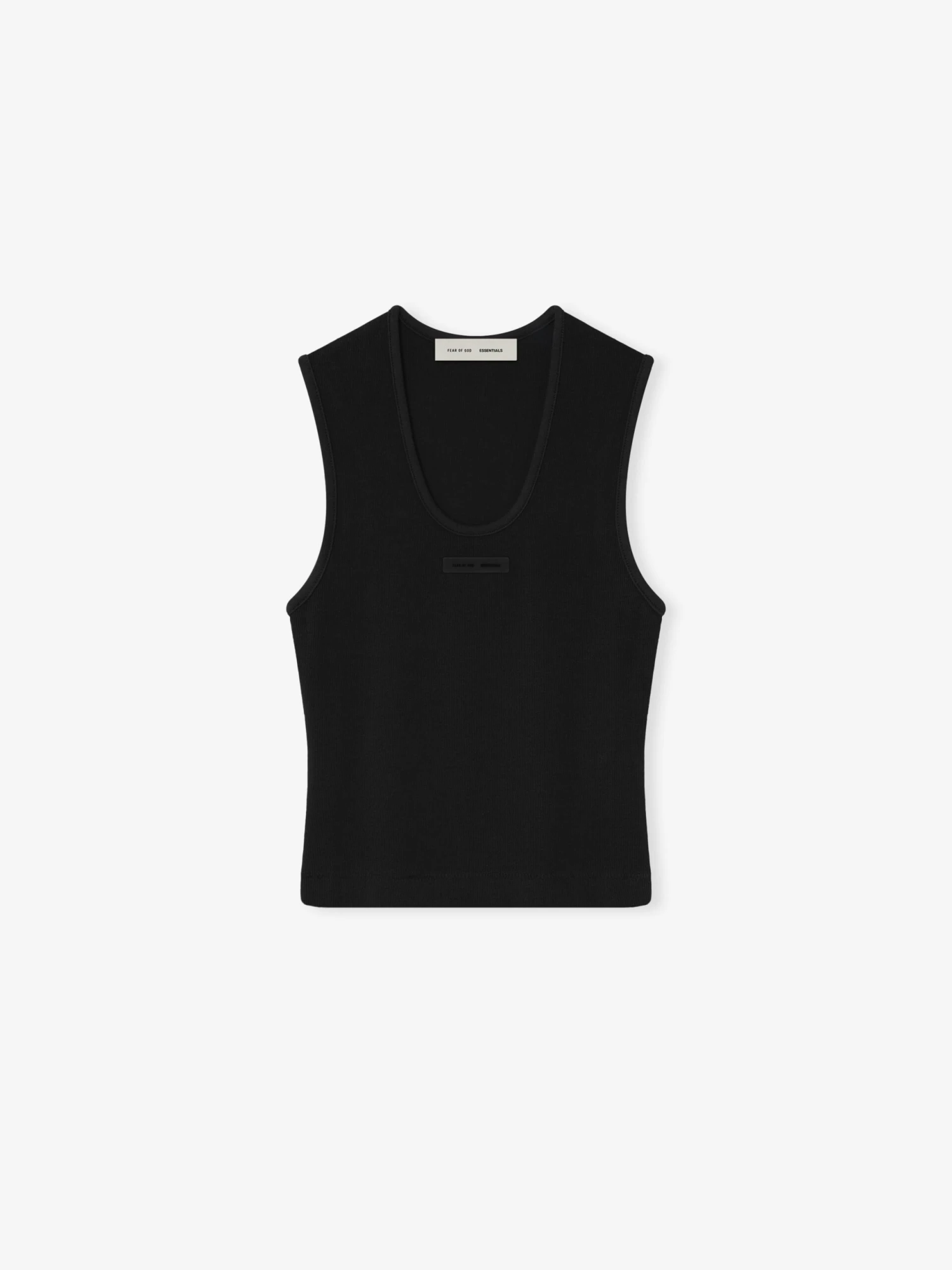 The Womens Rib Tank is crafted from a cotton/spandex jersey, offering a soft ribbed texture along with stretch and recovery. It features a U-neck design that contours to the body, ending at a cropped length. The tank showcases minimalist branding, highlighted by “Fear of God Essentials” rubberized label located on the center front and back collar.