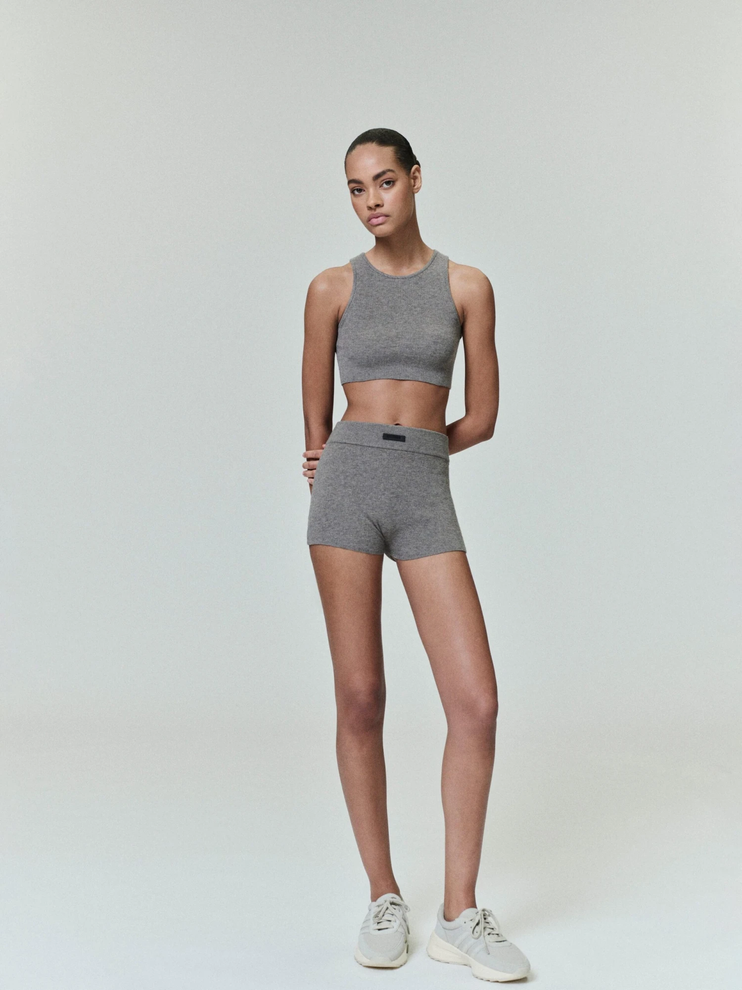 The Womens Soft Knit Boxer is made from poly-nylon rib knit for stretch comfort and texture. The cropped short comfortably contours around the body, and can be styled as stand-alone or layering piece. A rib-knit elastic waistband is detailed with a “Fear of God Essentials” rubberized label.
