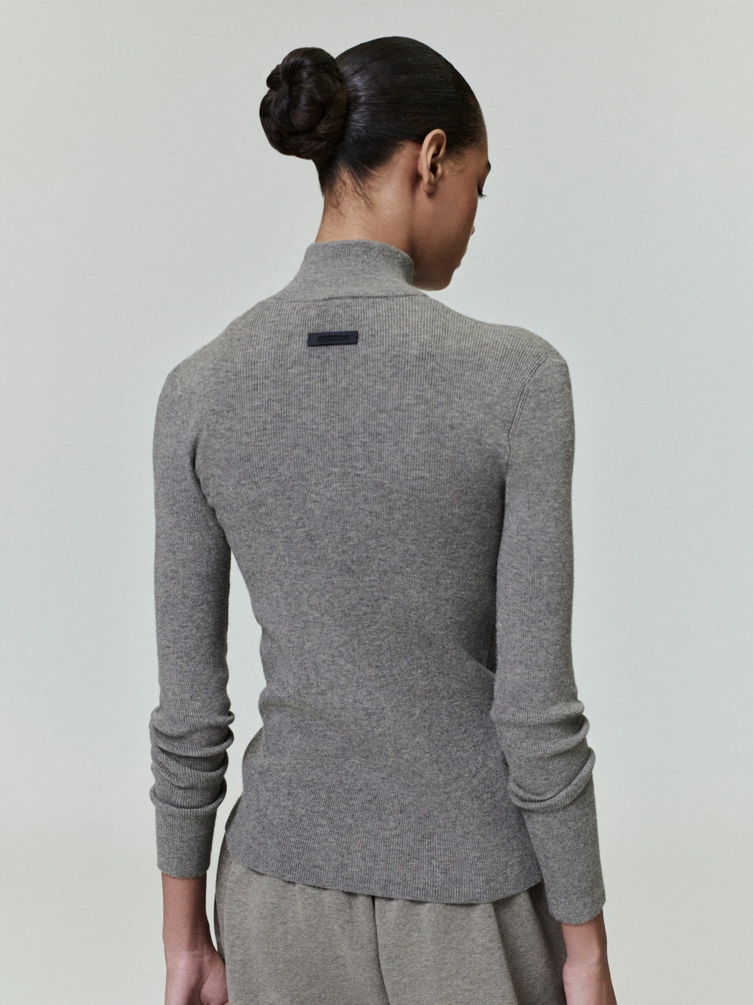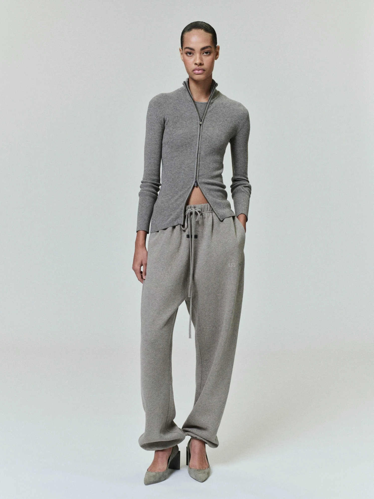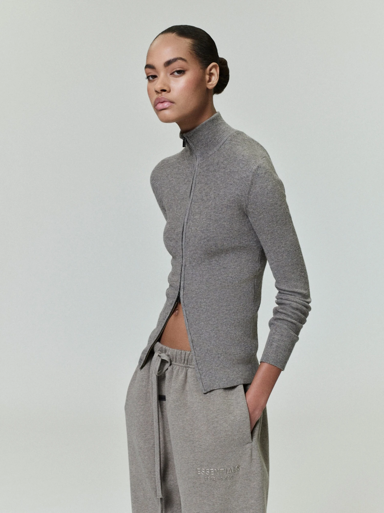 The Womens Soft Rib Knit Zip-Up is crafted from a poly-nylon rib knit, providing both stretch and comfort. This full-zip design is form-fitting and features a versatile 2-way zipper that enhances layering. A “Fear of God Essentials” rubberized label located at the back of the collar.