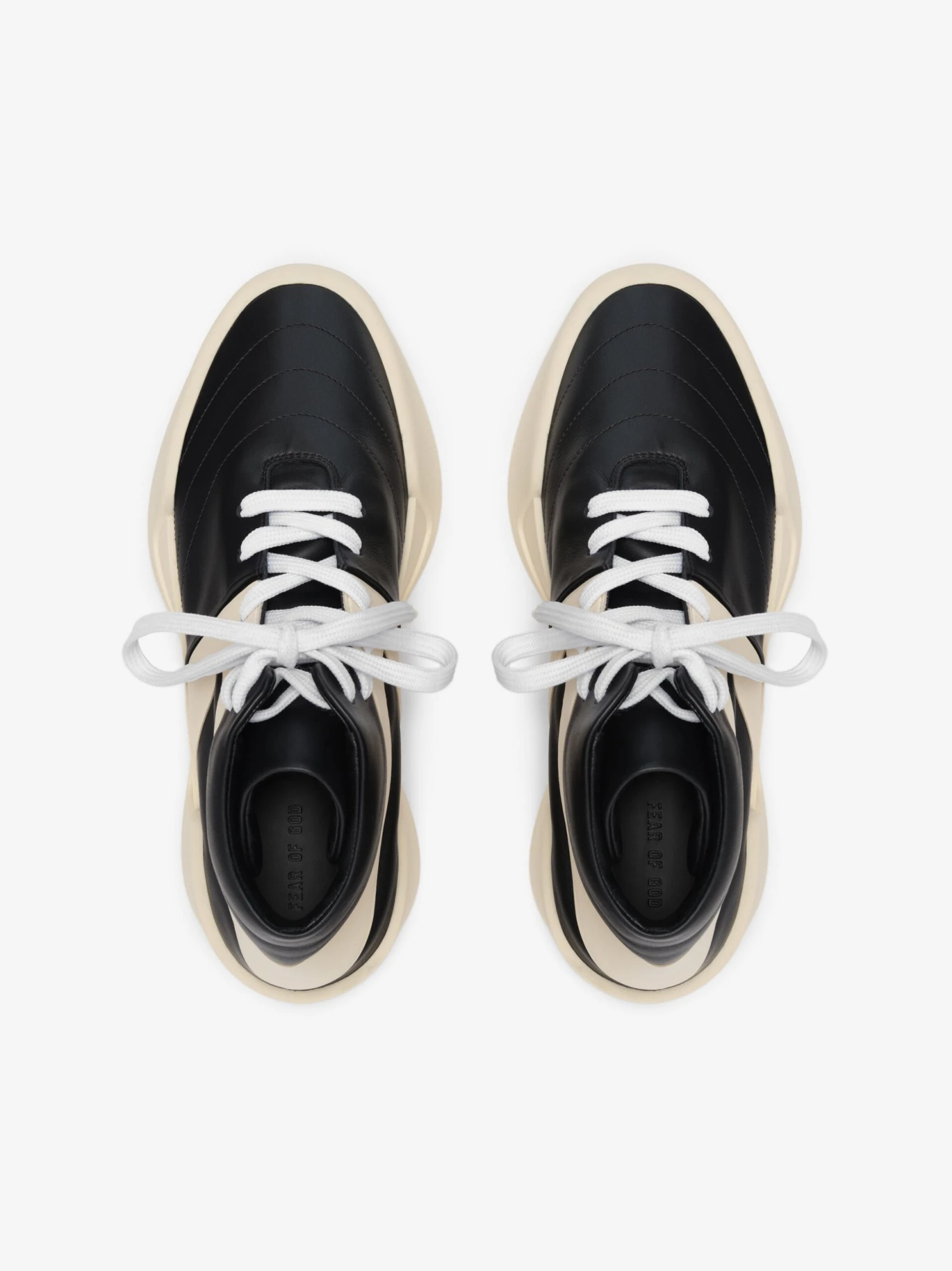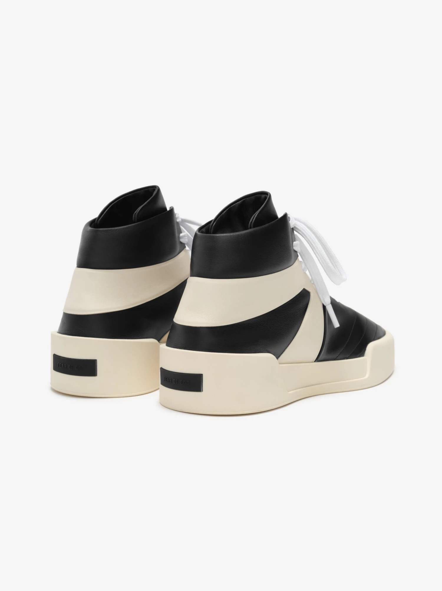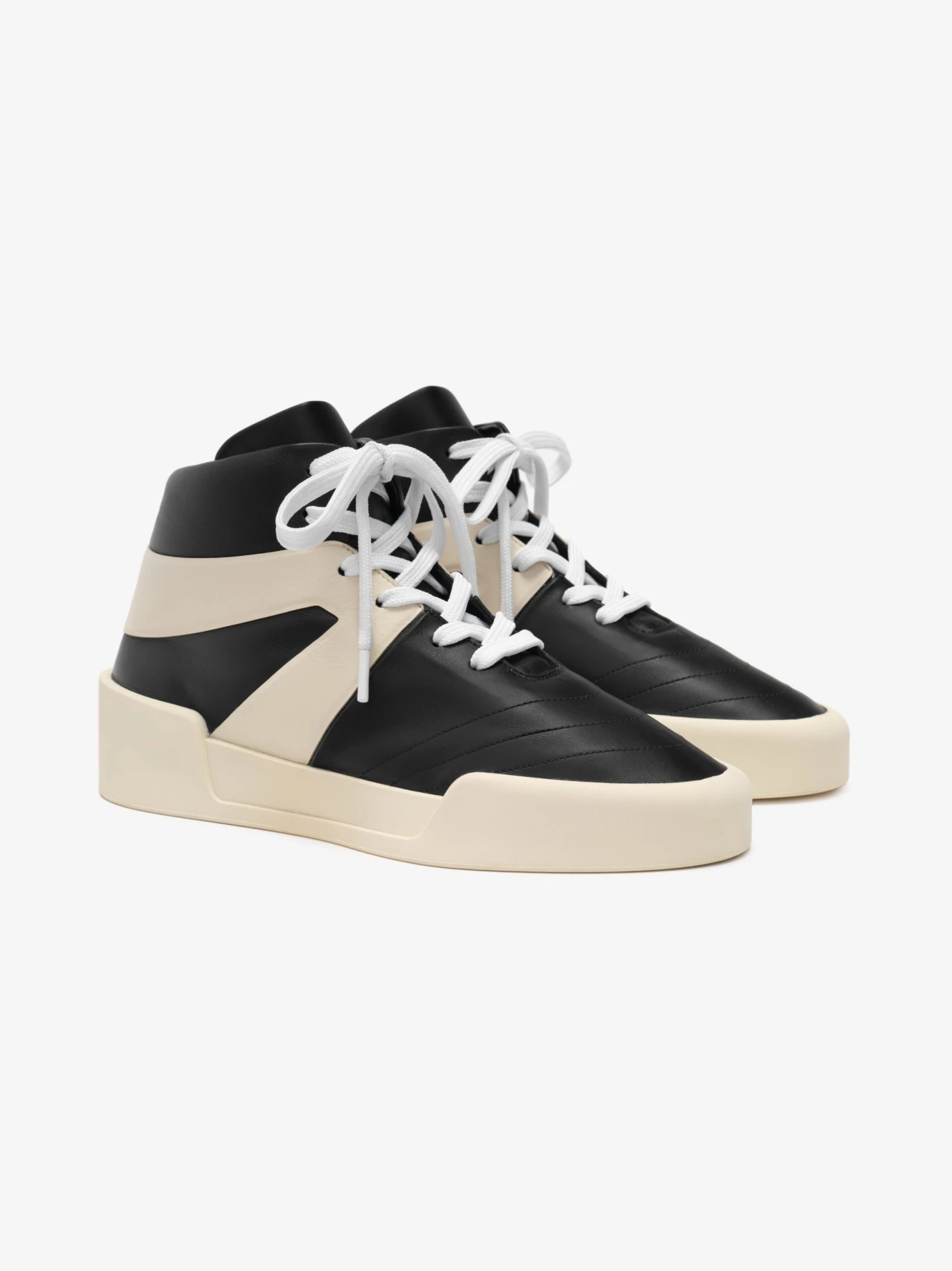 The Basketball Sneaker is crafted from premium flat Italian leather in a high top style rooted in Fear of God sportswear heritage. The sculpted high-top sneaker has a laced front, Fear of God graphic logo, rubber Aerobic outsole, and a Fear of God black bar label on the heel.