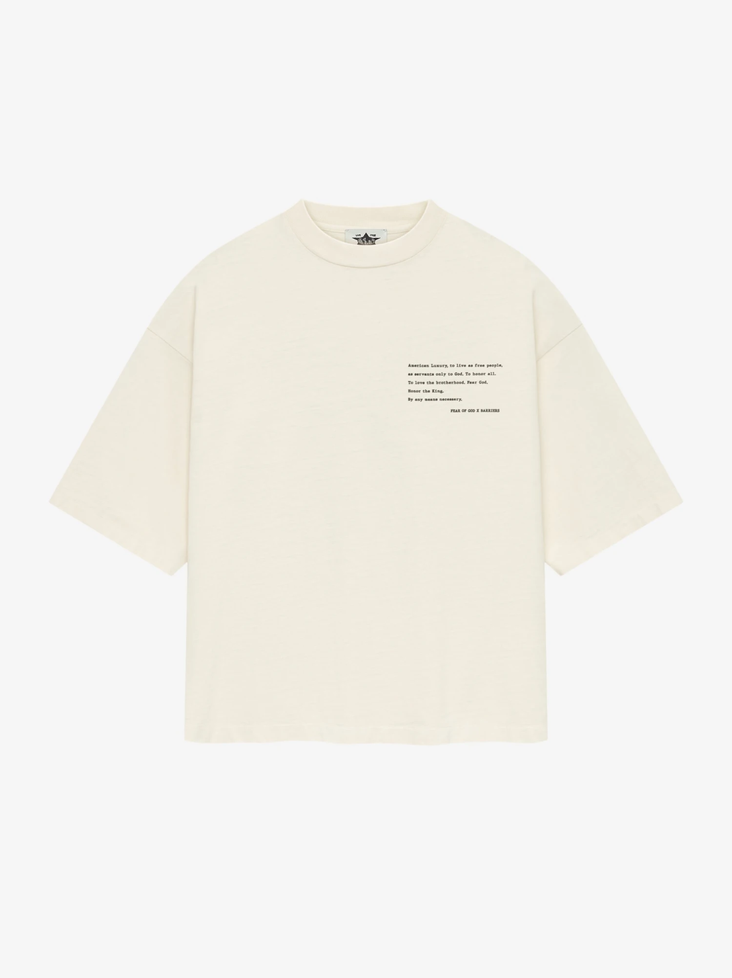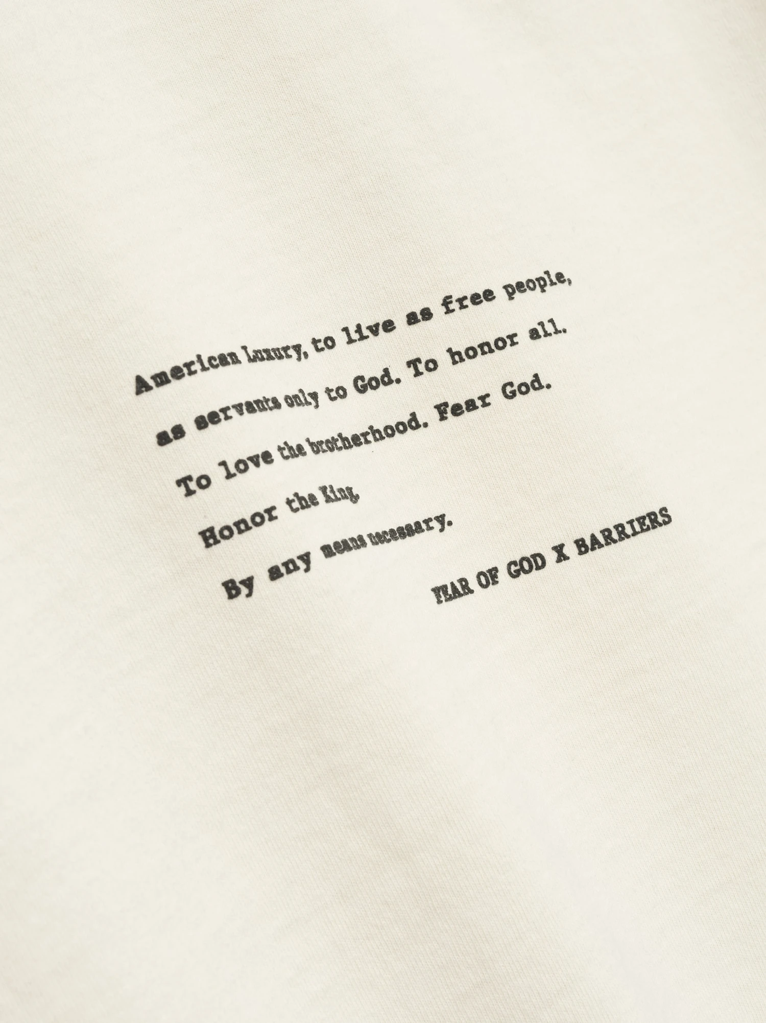 In honor of Malcolm X’s 100th birthday, Fear of God has partnered with Barriers to create a limited-edition capsule collection. The short sleeve tee is made in the USA from 100% cotton jersey with hand-printed graphics to add visual impact to the front and back of the piece. This piece is designed with a relaxed fit with drop shoulders, and 3/4 sleeves. A Fear of God label is stitched at the back collar.