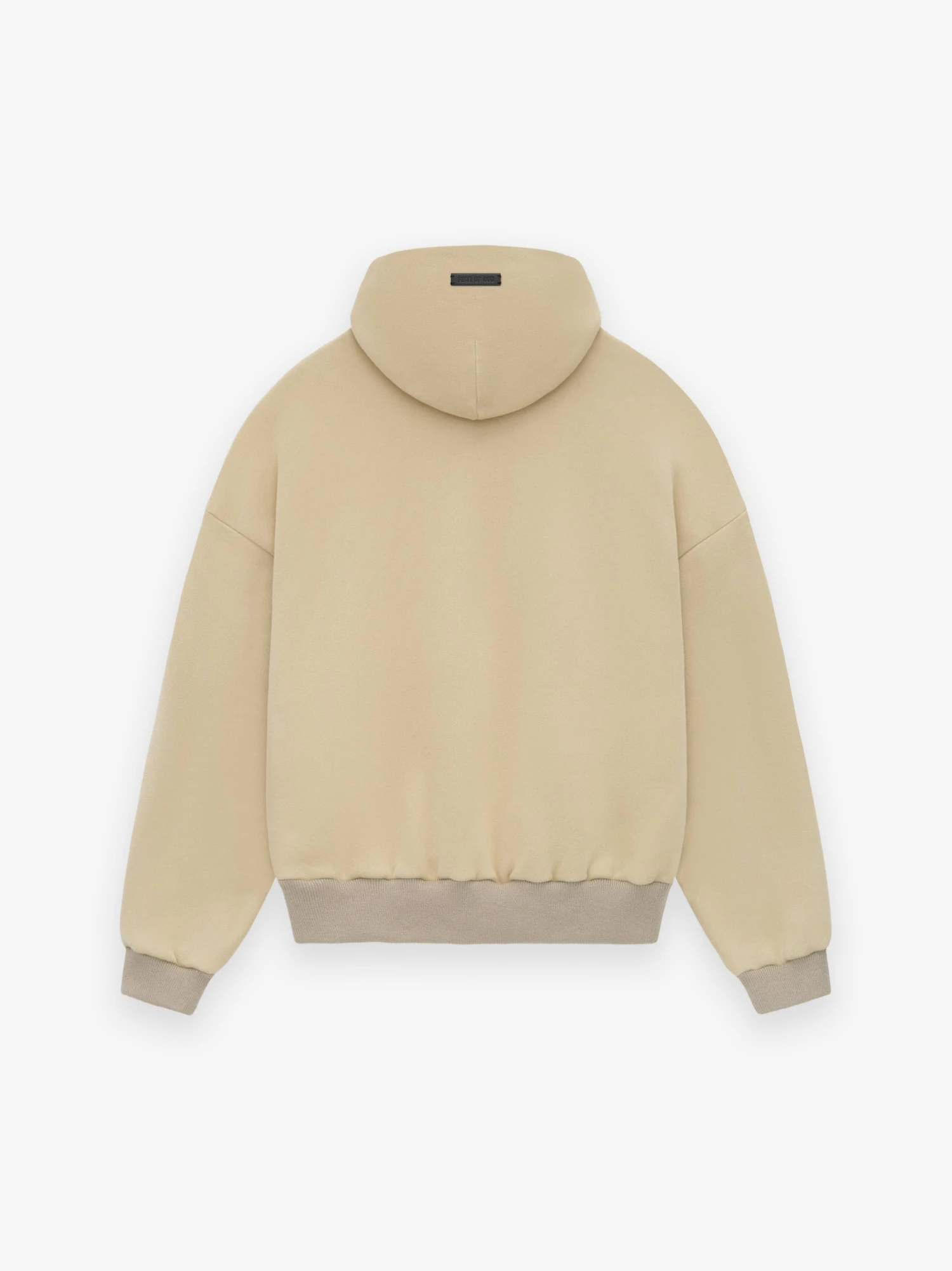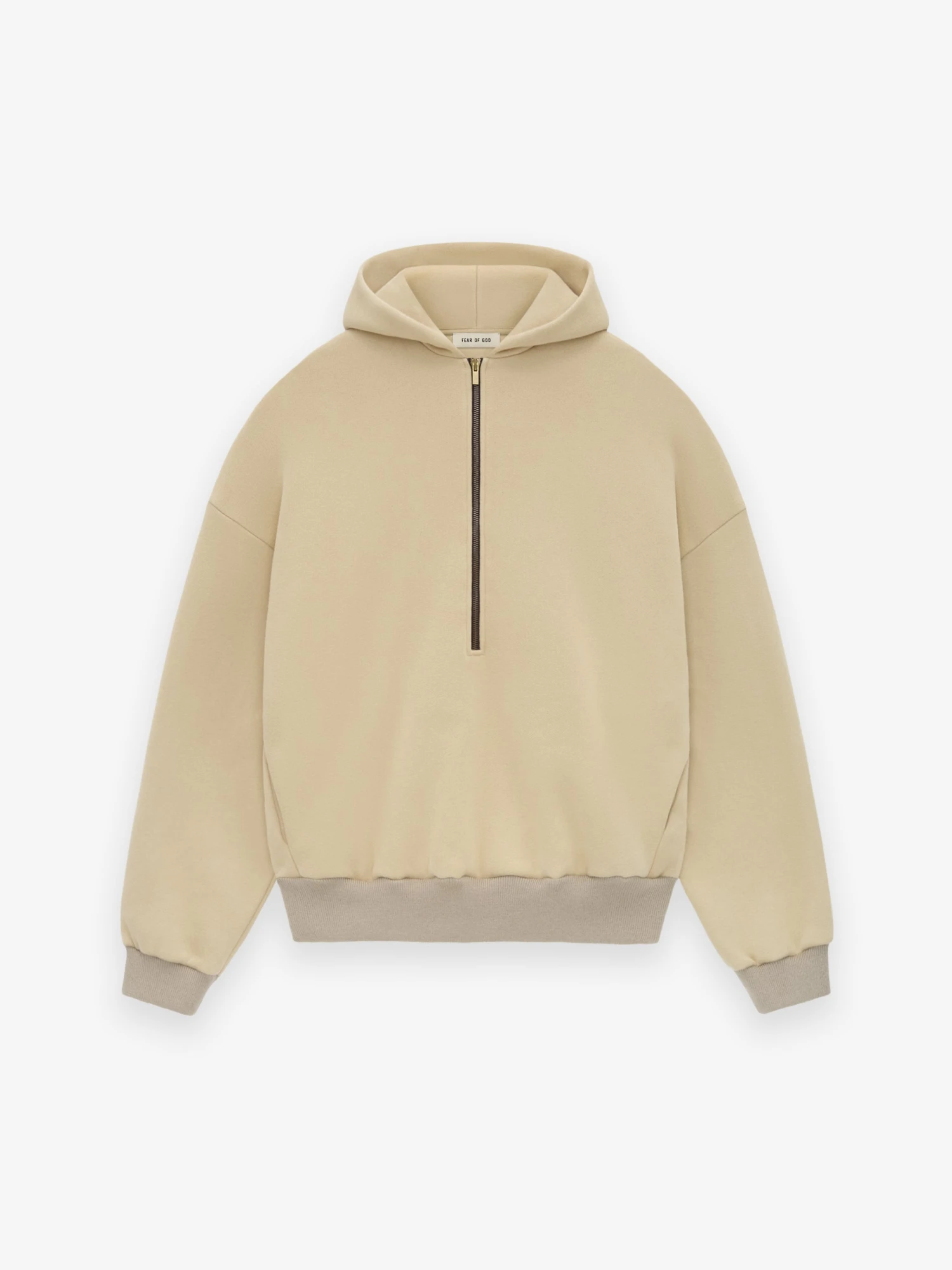 The Half Zip Hoodie is made in Portugal from a heavy cotton blend to contribute depth and softness. The signature Fear of God fit is evident with a relaxed silhouette, dropped shoulders, double-layered hood, and wool rib-knit cuffs, and waist hem. Additional details include a half-zip front, side pockets, and a leather Fear of God label is stitched on the hood.