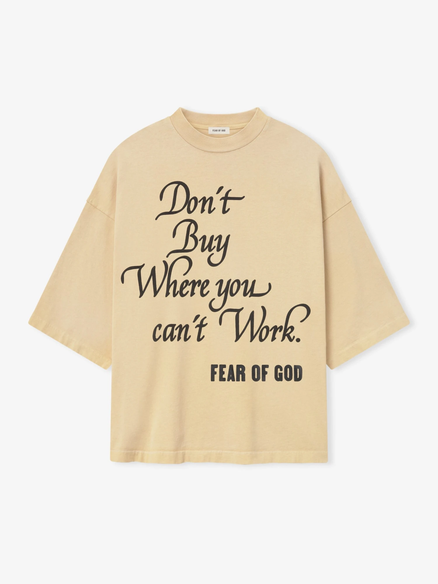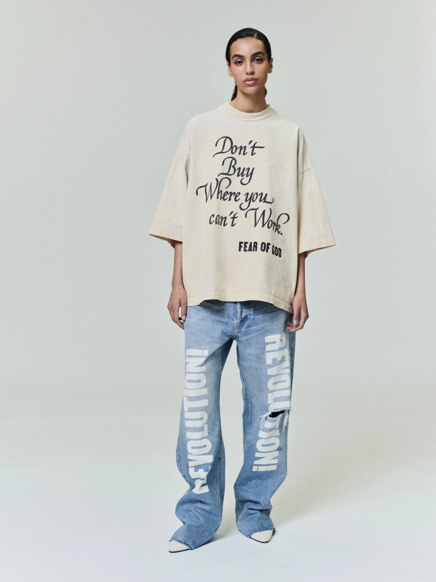 The Freedom Now Tee is crafted in the USA from 100% heavyweight cotton jersey and features a garment wash with a sunfade treatment for an authentic vintage appearance. The hand-printed graphics are inspired by the civil rights movement. This rib-knit crewneck tee has a relaxed fit with drop shoulders and 3/4 sleeves. A Fear of God label is stitched at the back collar.