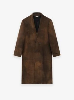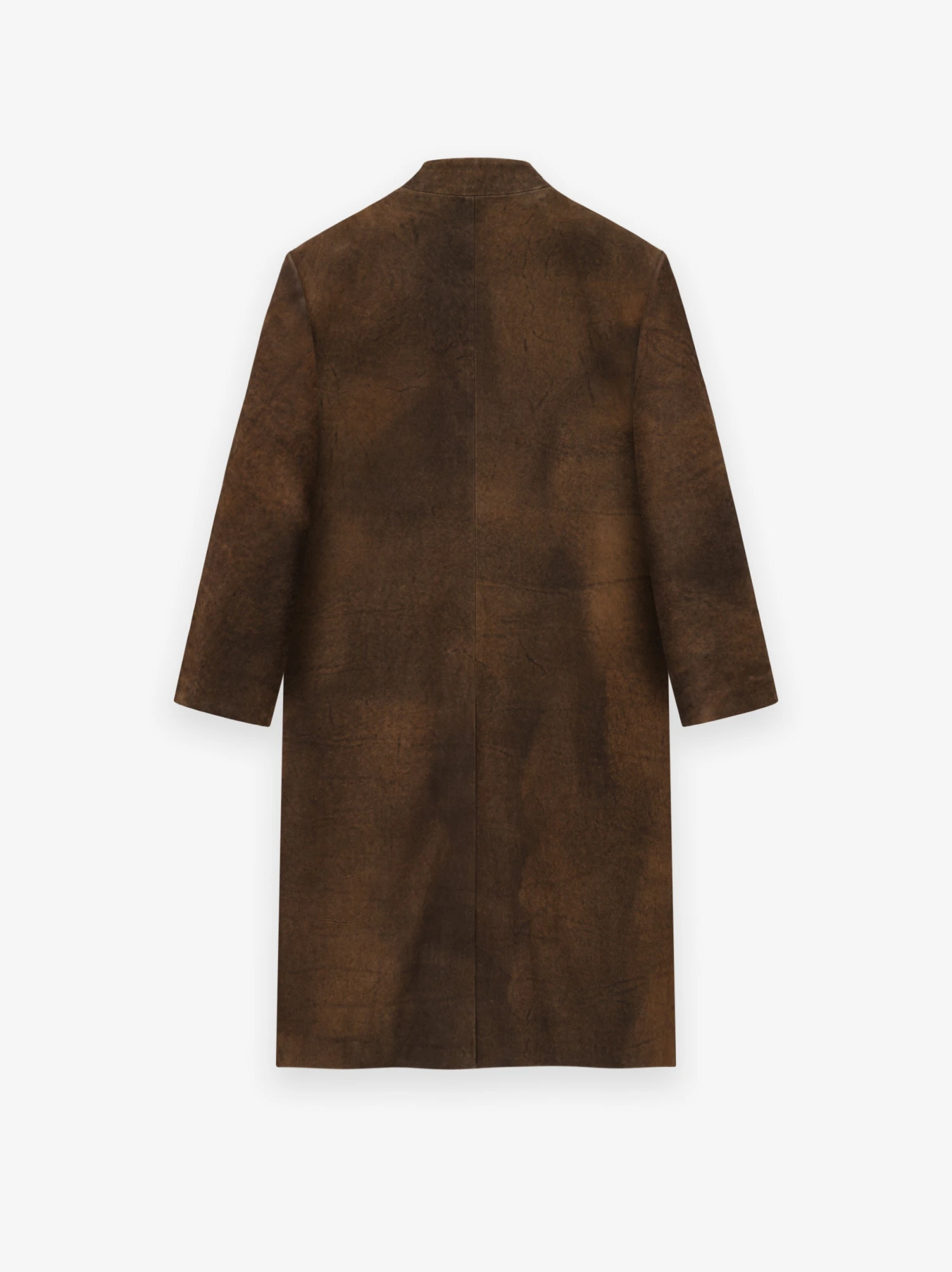 The Leather Lapelless Coat is crafted in Italy from butter-soft nubuck leather, complemented by iridescent cupro lining. The lapelless, double-breasted style is voluminous in the body to provide comfortable layering. Additional details include horn summary closures, side pockets, and a leather Fear of God label stitched on the sleeve.