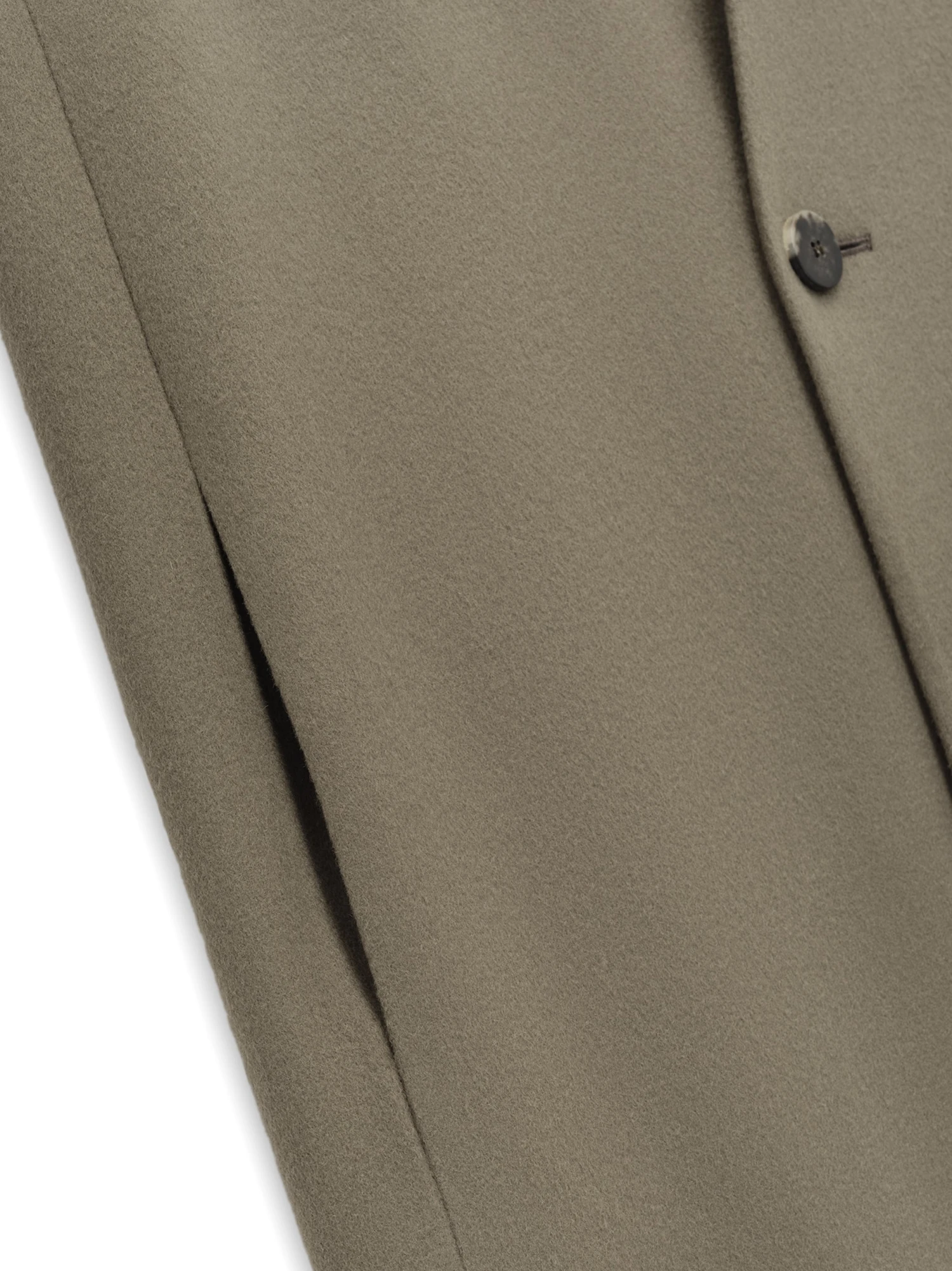The Lapelless Overcoat is tailored in Italy from an classic Melton wool with a soft hand feel, complemented by iridescent cupro lining. The lapelless, double-breasted style is voluminous in the body to provide comfortable layering. Additional details include horn summary closures and side pockets. A leather Fear of God is stitched on the sleeve.