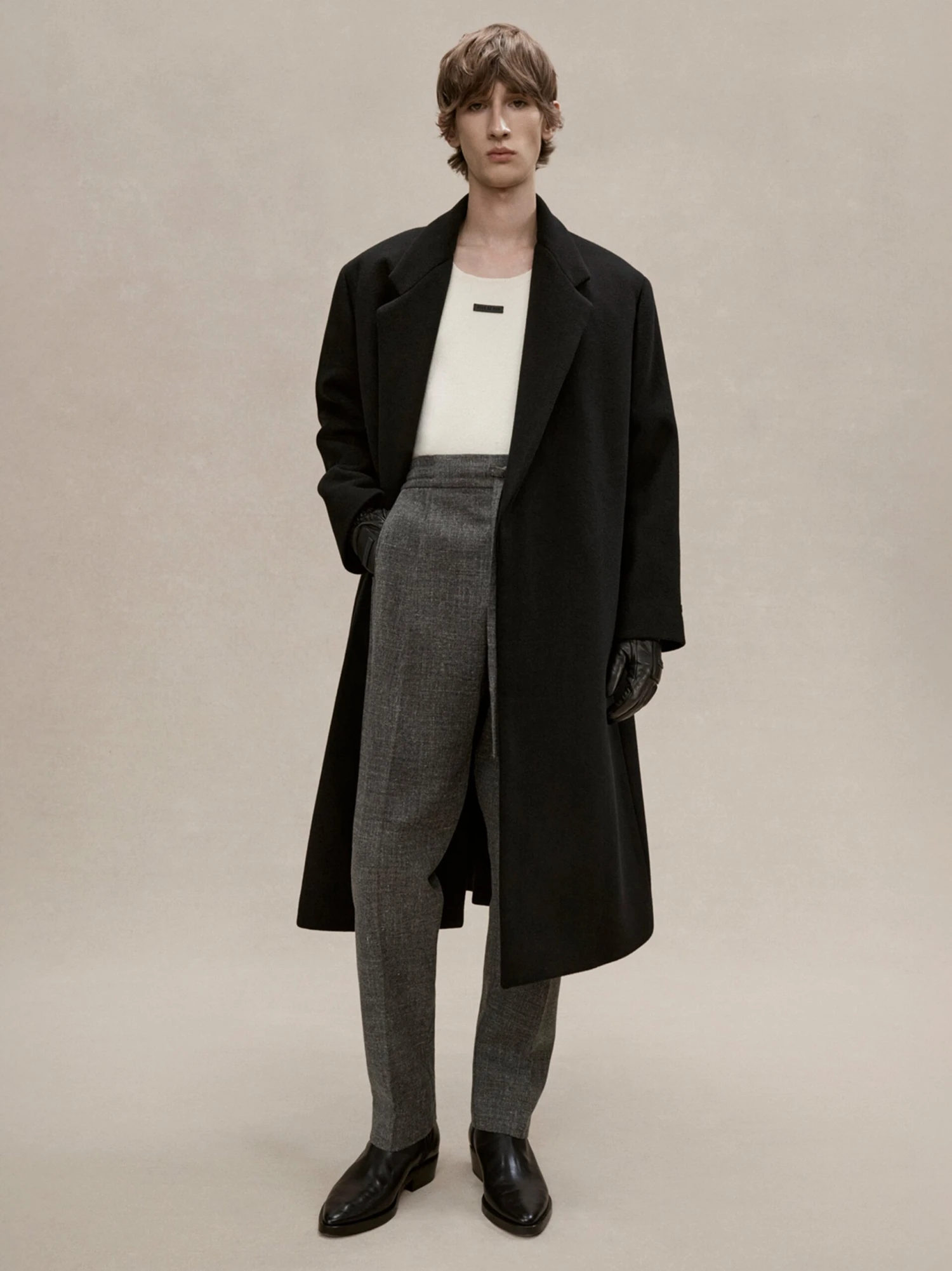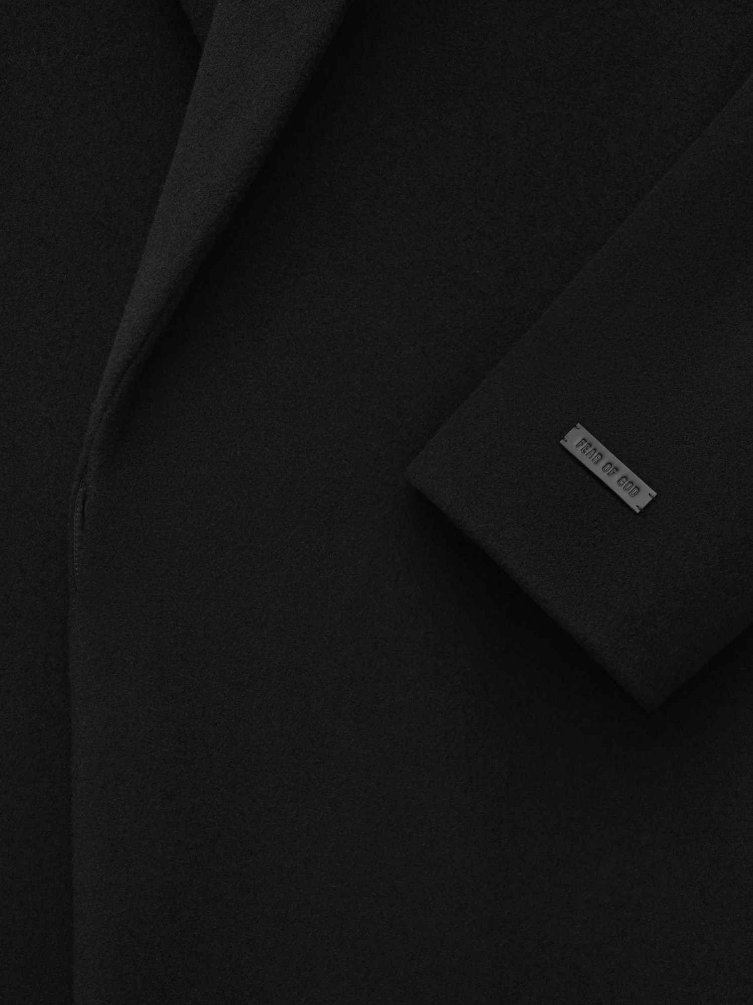 The Overcoat is tailored in Italy from classic Melton wool with a soft hand feel, complemented by iridescent cupro lining. The double-breasted style is voluminous in the body to provide comfortable layering. Details include horn summary closures, side pockets, and a Fear of God stitched on the sleeve.