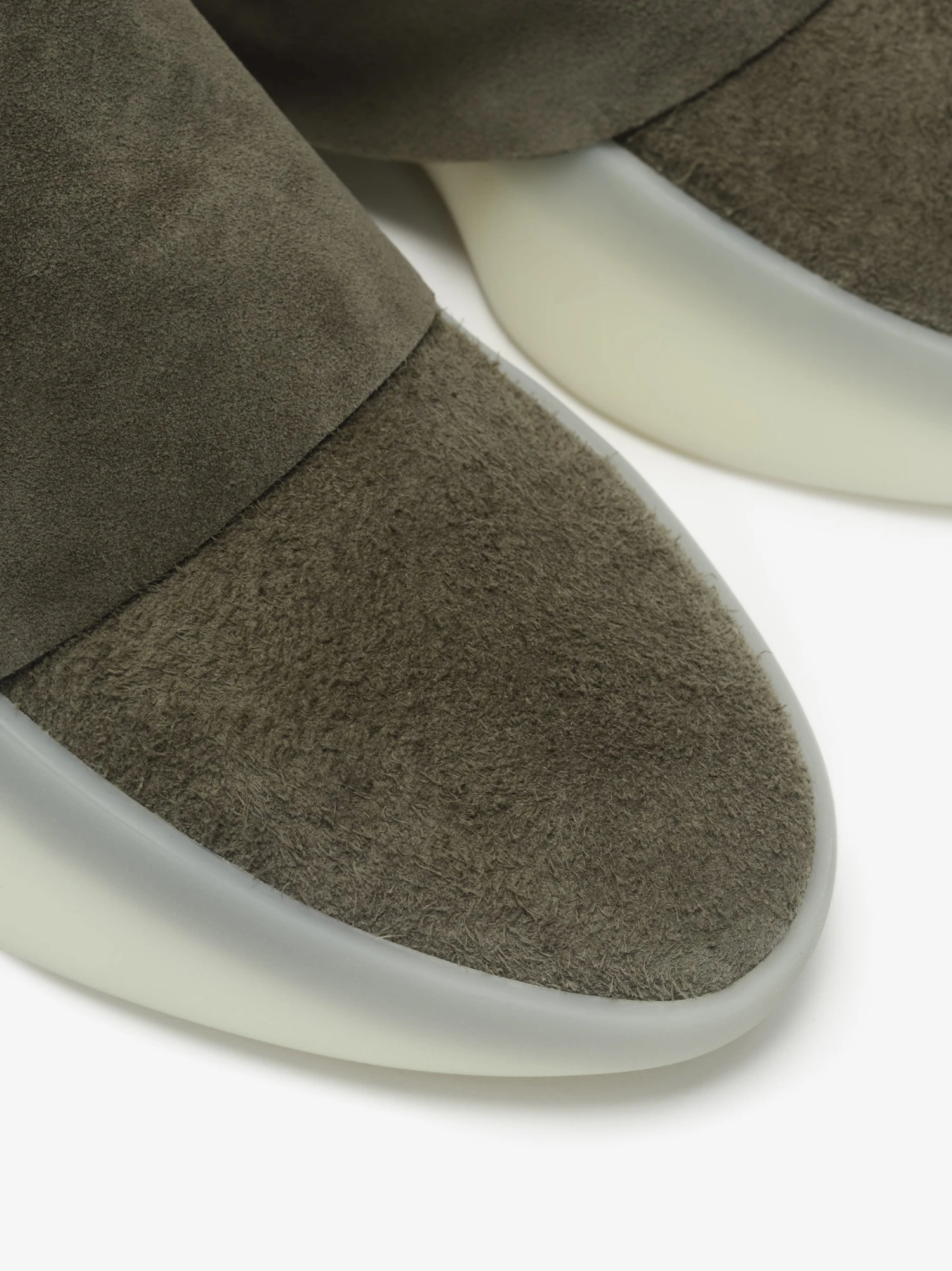 The Moc Low Runner is crafted in Italy from soft suede with a smooth, supple texture. The design combines the traditional Native American moccasin upper with an updated rubber moc runner outsole. It includes details such as a wide suede collar, a lace-up heel for adjustability, and Fear of God black bar label on the heel.
