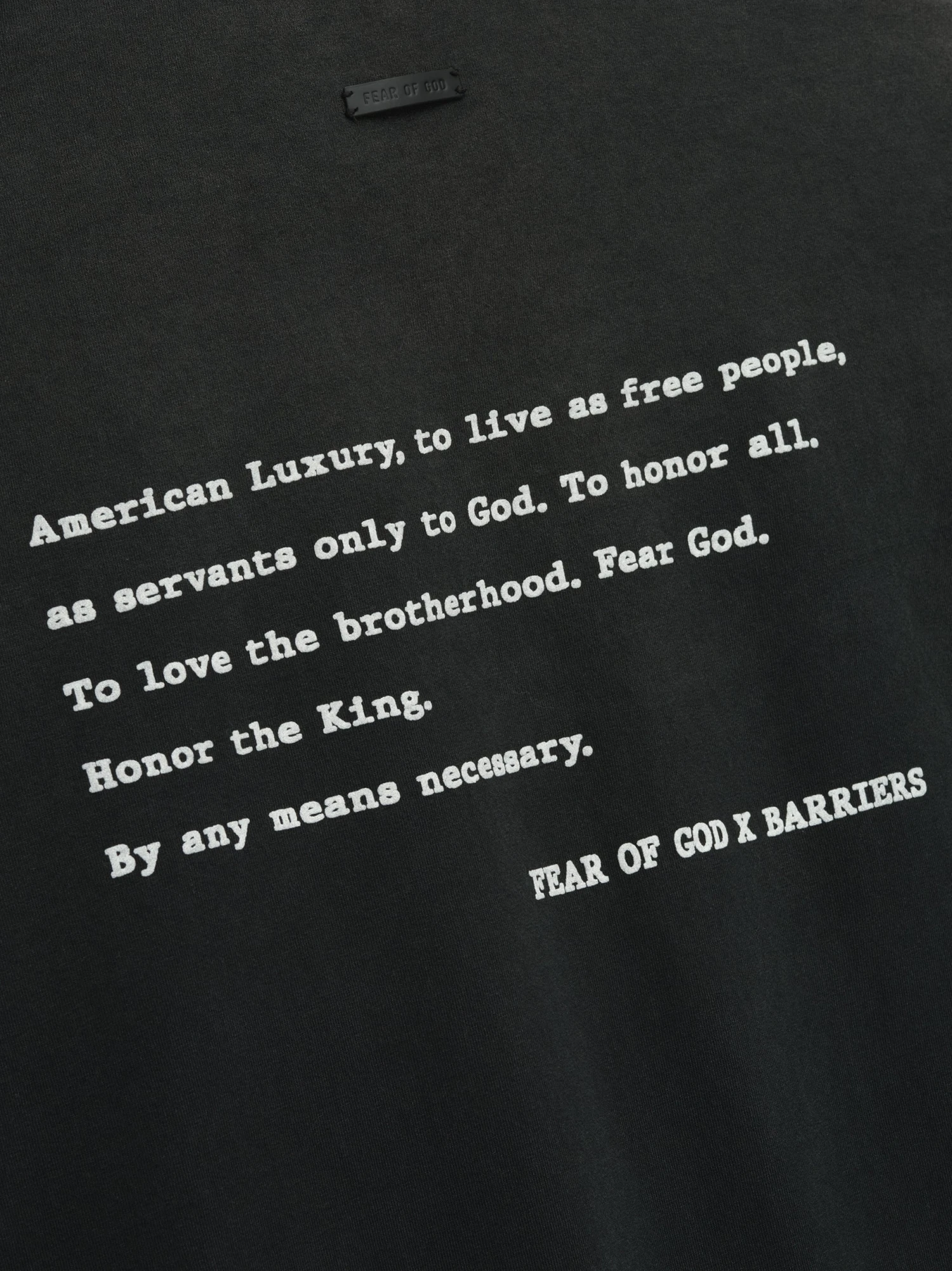 In honor of Malcolm X’s 100th birthday, Fear of God has partnered with Barriers to create a limited-edition capsule collection. The short sleeve tee is made in the USA from 100% cotton jersey with hand-printed graphics to add visual impact to the front and back of the piece. This piece is designed with a relaxed fit with drop shoulders, and 3/4 sleeves. A Fear of God label is stitched at the back collar.
