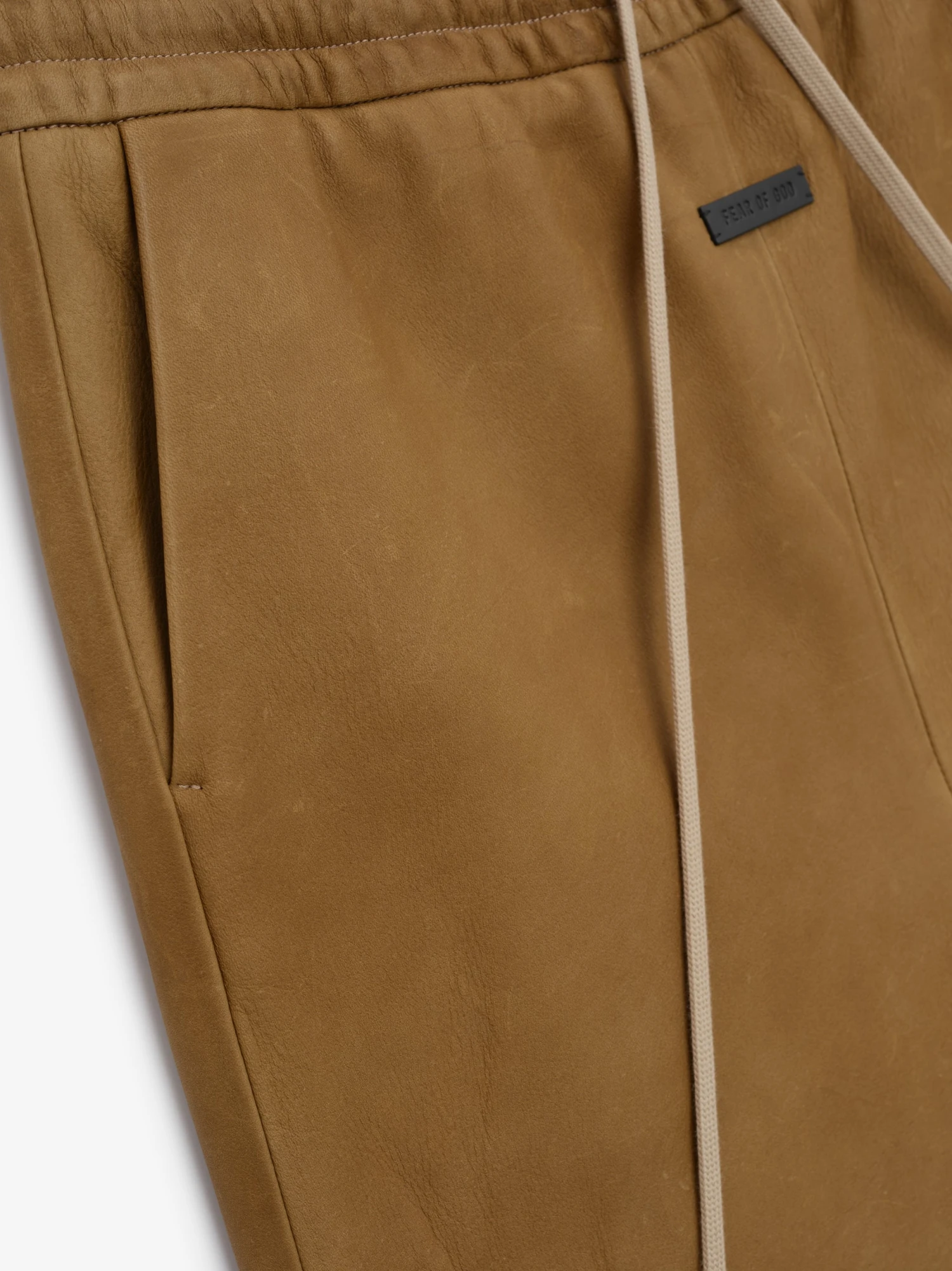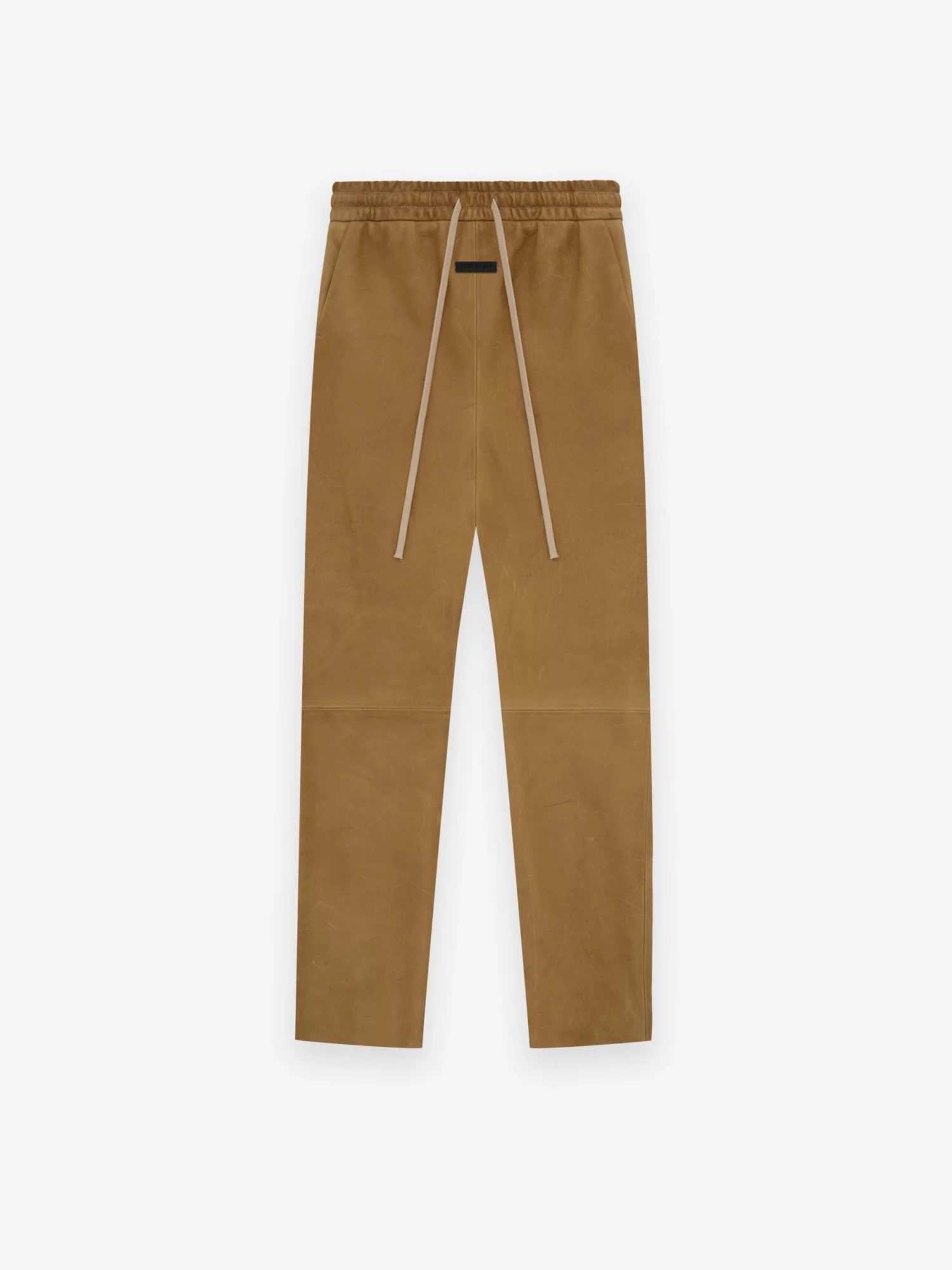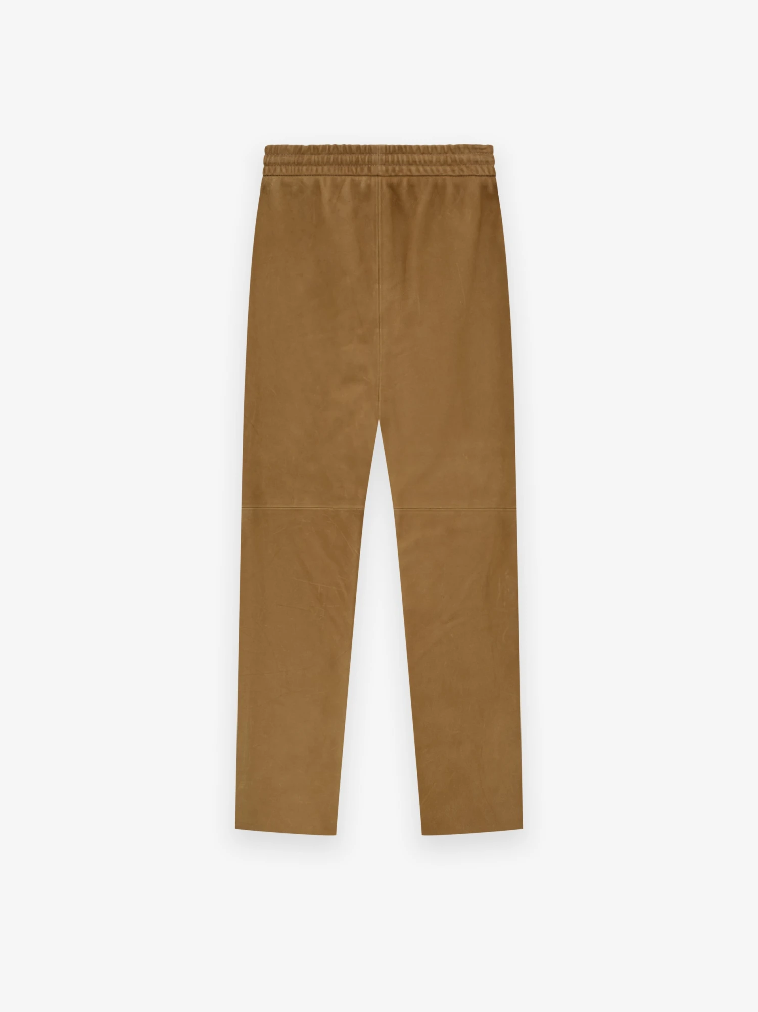 The Suede Forum Pant is crafted from heavy Italian suede with soft distressing for a vintage appearance. The piece features signature Fear of God design elements, such as a relaxed leg, dropped inseam, and elasticated waistband with elongated drawstrings. A Fear of God leather label is stitched on the center front.