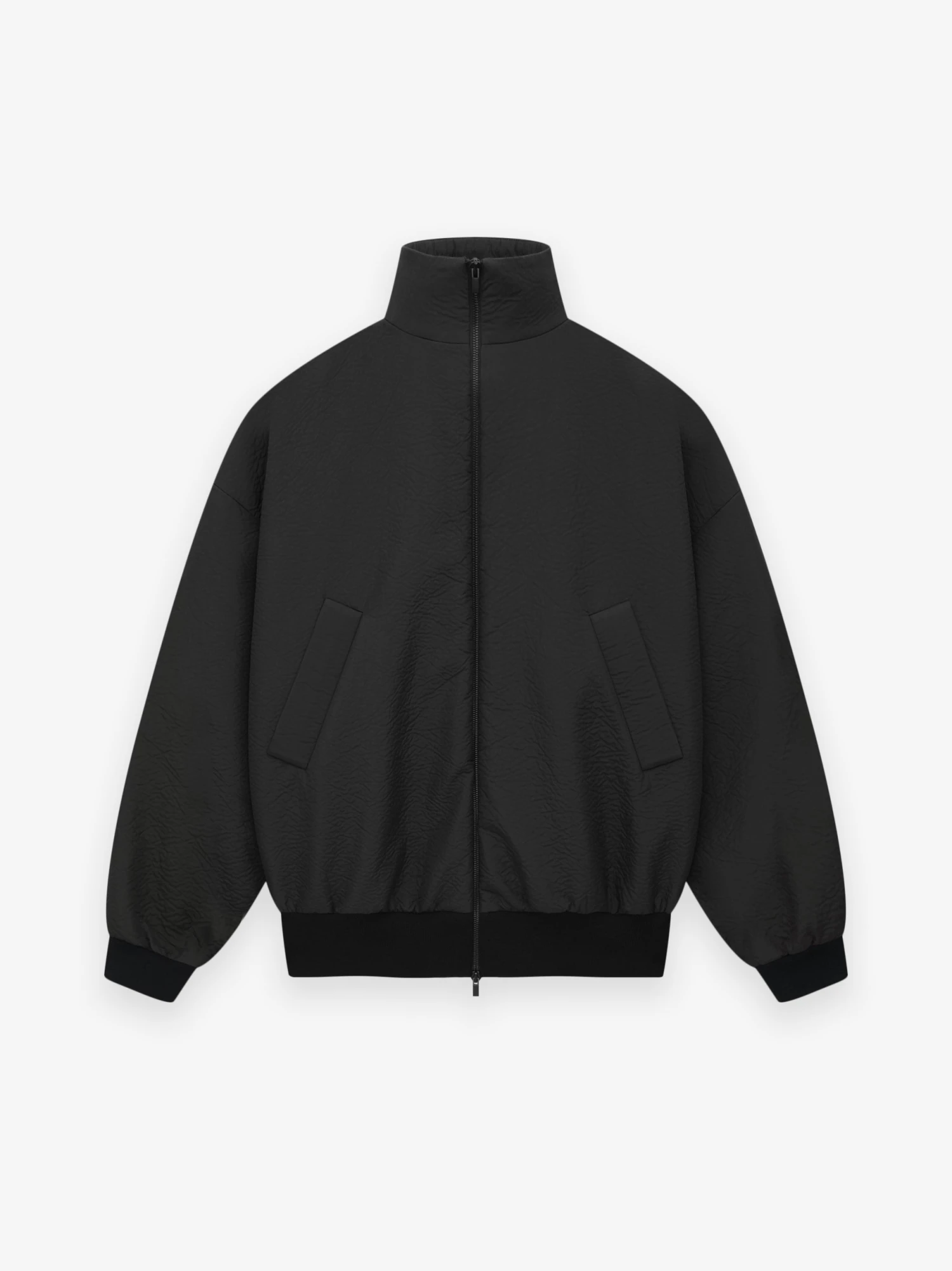 The Track Jacket is crafted in Italy from textured polyester, giving this sportswear piece a distinctive character. This full-zip jacket features light fill, high neckline, front welt pockets, and rib-knit hems at the waist and cuffs. A Fear of God label is stitched at the back of the collar.
