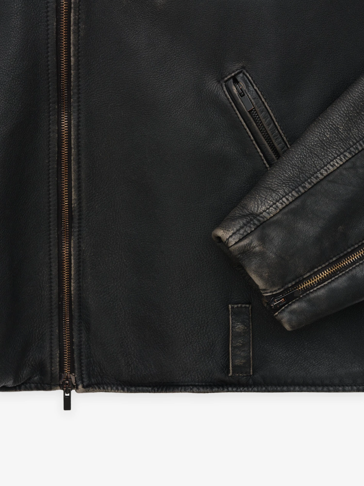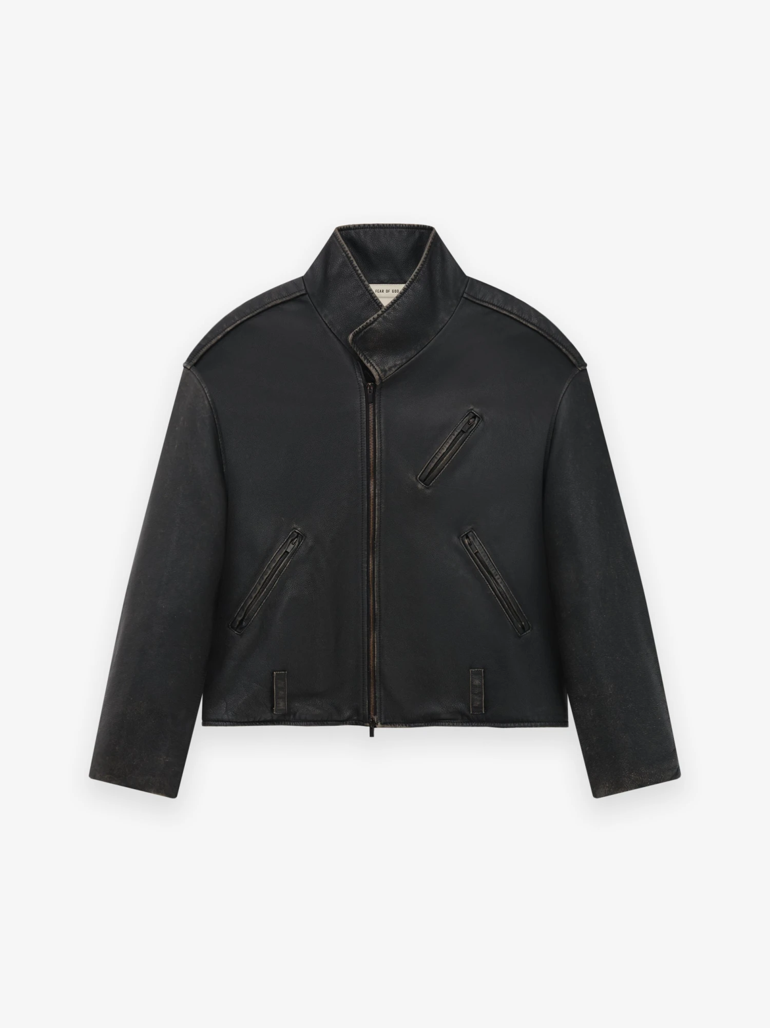 The Vintage motorcycle Jacket is crafted in Italy from hand-vintaged leather and accented by a cupro lining for an elegant finish. The timeless design is born from the iconic heritage of the American motorcycle jacket but modernized with a relaxed fit. Details include antique brass zippers on the front and side pockets. A leather Fear of God label is stitched at the back collar.