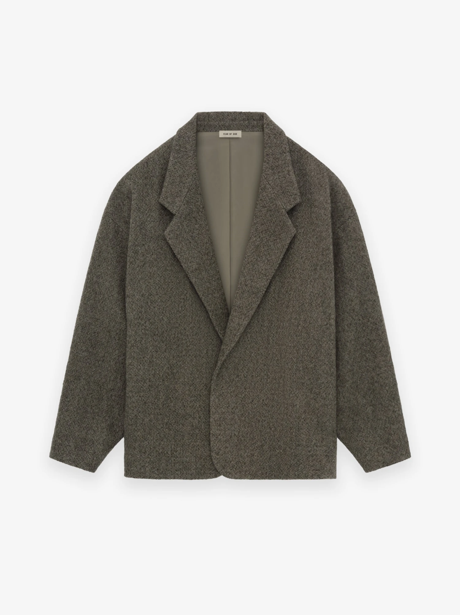 The California Blazer is tailored in Italy from richly textured virgin wool, offering a striking appearance. This casual blazer features a cropped, boxy silhouette with soft shoulders and no closure. It is enhanced by an iridescent cupro lining, convenient side pockets, and a Leather Fear of God label stitched on the sleeve.