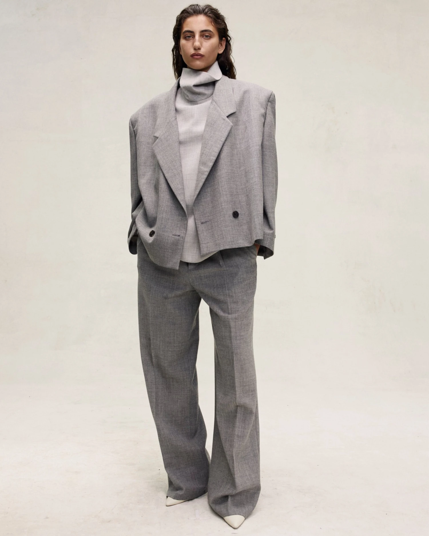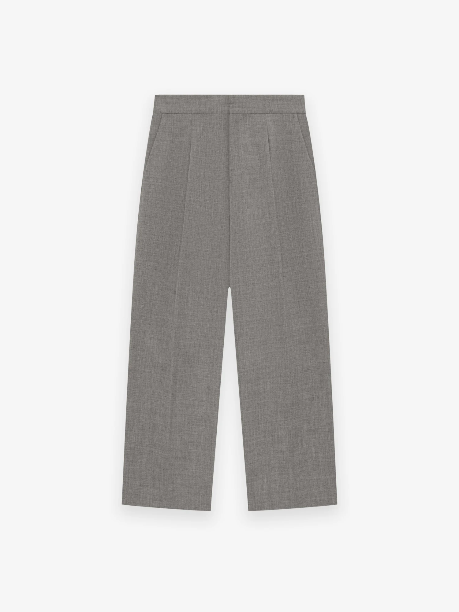 The Single Pleat Wide Leg Trouser is tailored in Italy from a traditional menswear wool canvas to balance structure and drape in the voluminous silhouette. The pant is designed to style singularly or pair with the matching Cropped Blazer. The high-waisted trouser style is detailed with side pockets, and leather Fear of God label.