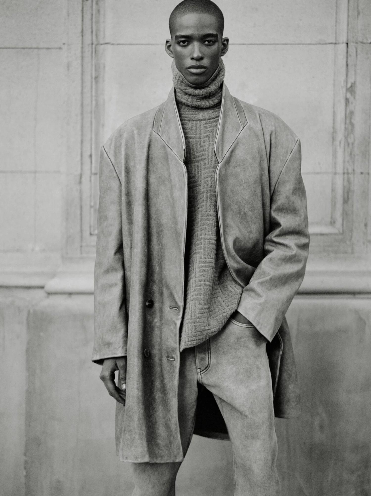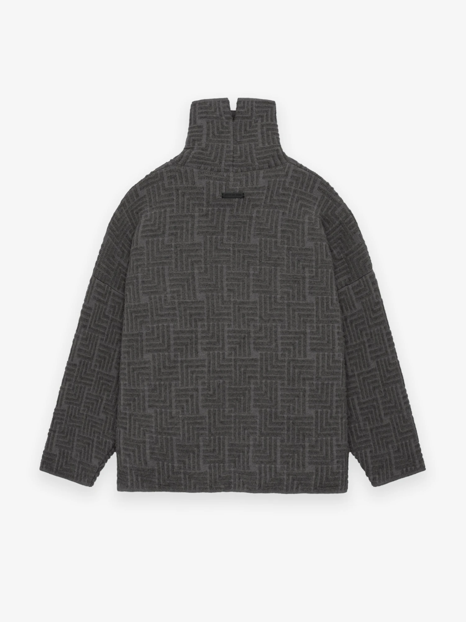 The High Neck Sweater is knitted in Italy from a virgin wool blend in a jacquard geometric design. The design features a split turtleneck with volume in the body and sleeves creating a round silhouette. A Fear of God leather label is stitched at the back collar.