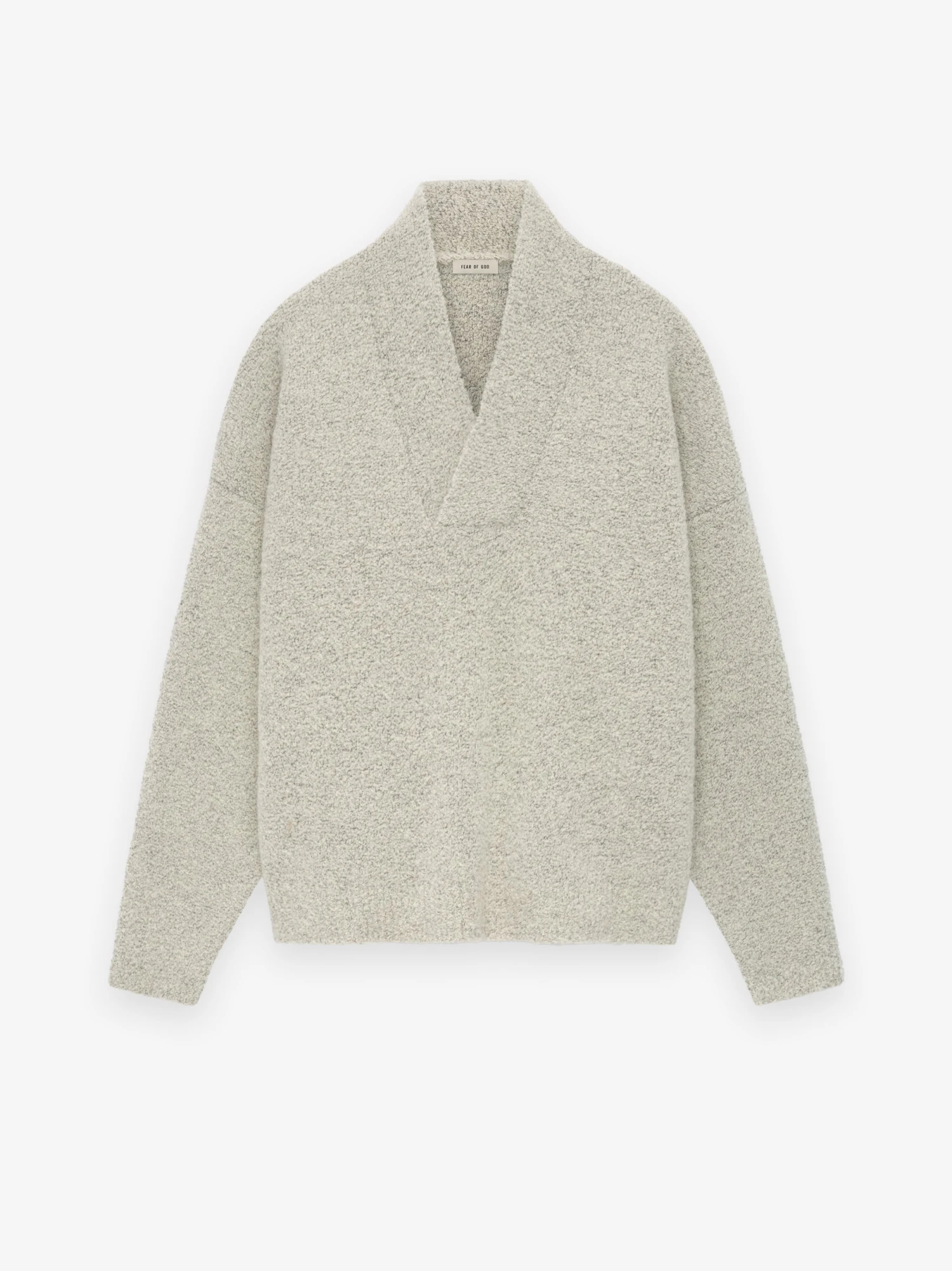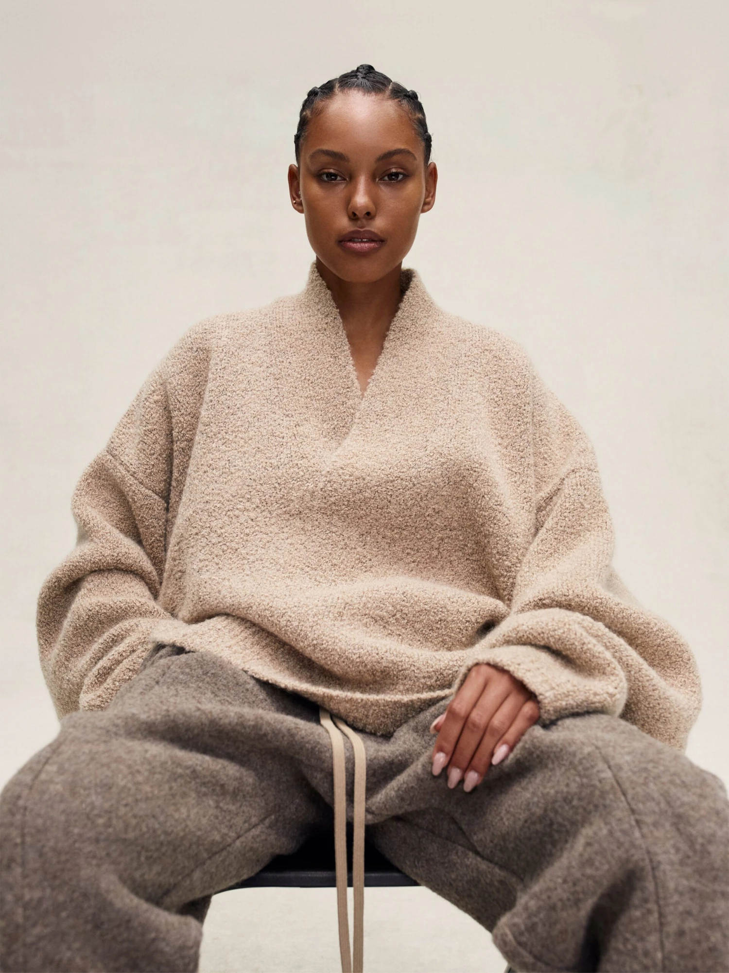 The V-Neck Sweater is knitted in Italy from a blend of wool mohair and virgin wool in a heavy boucle texture. The relaxed fit in the body and sleeves creates a round silhouette. The wide V-neckline, rib-knit cuffs, and a straight waist hem frame the piece. A Fear of God leather label is stitched at the back collar.