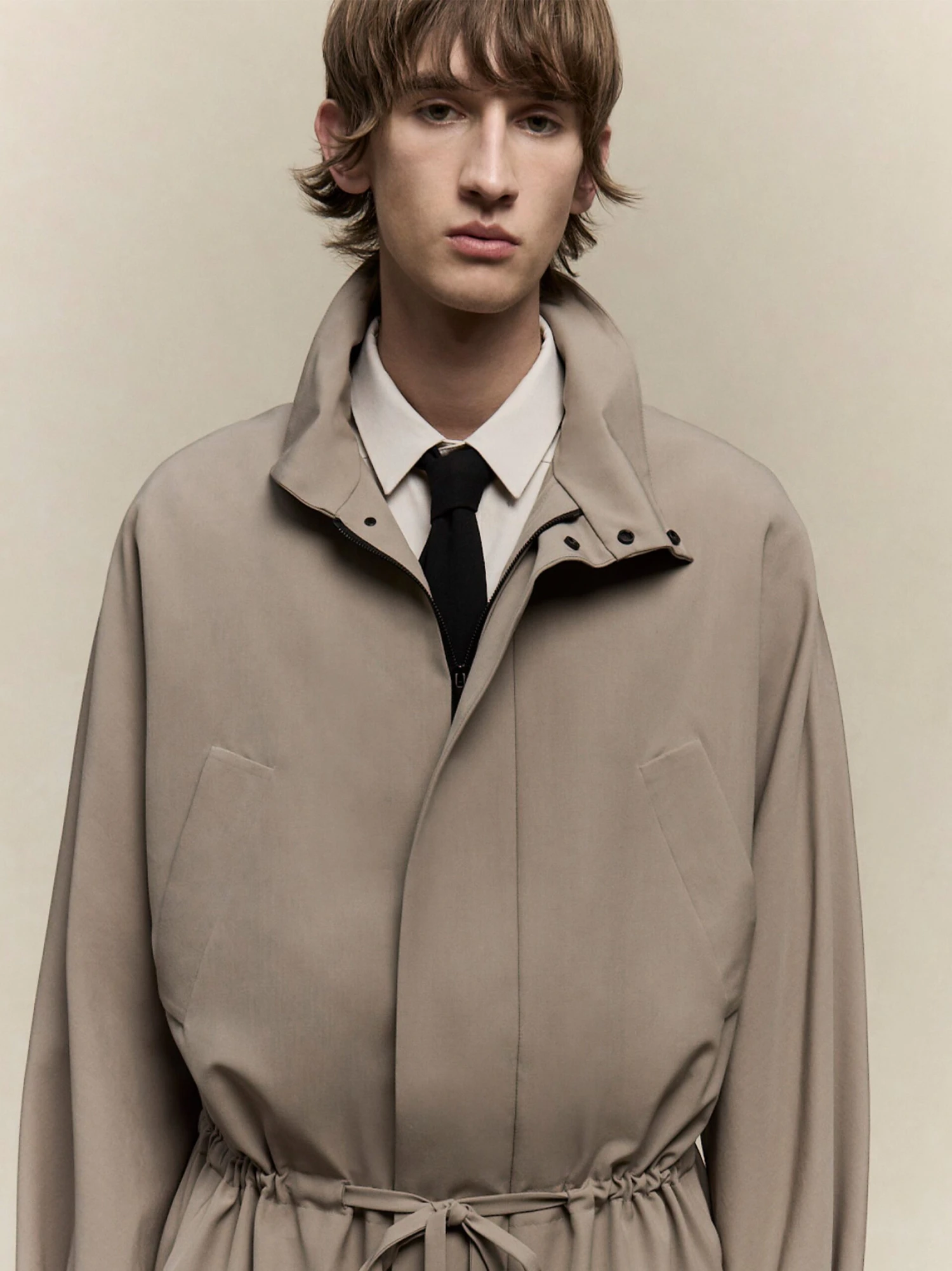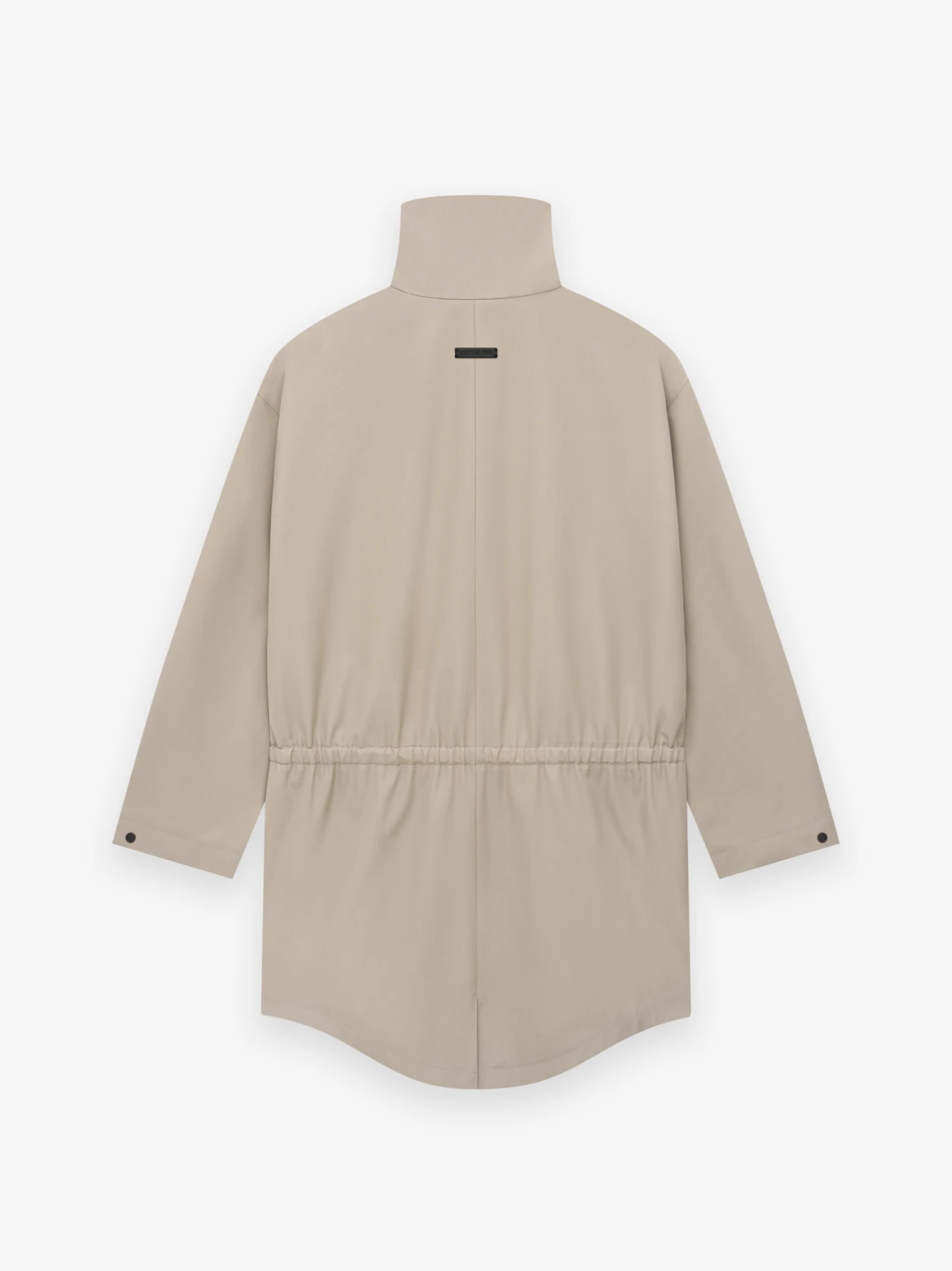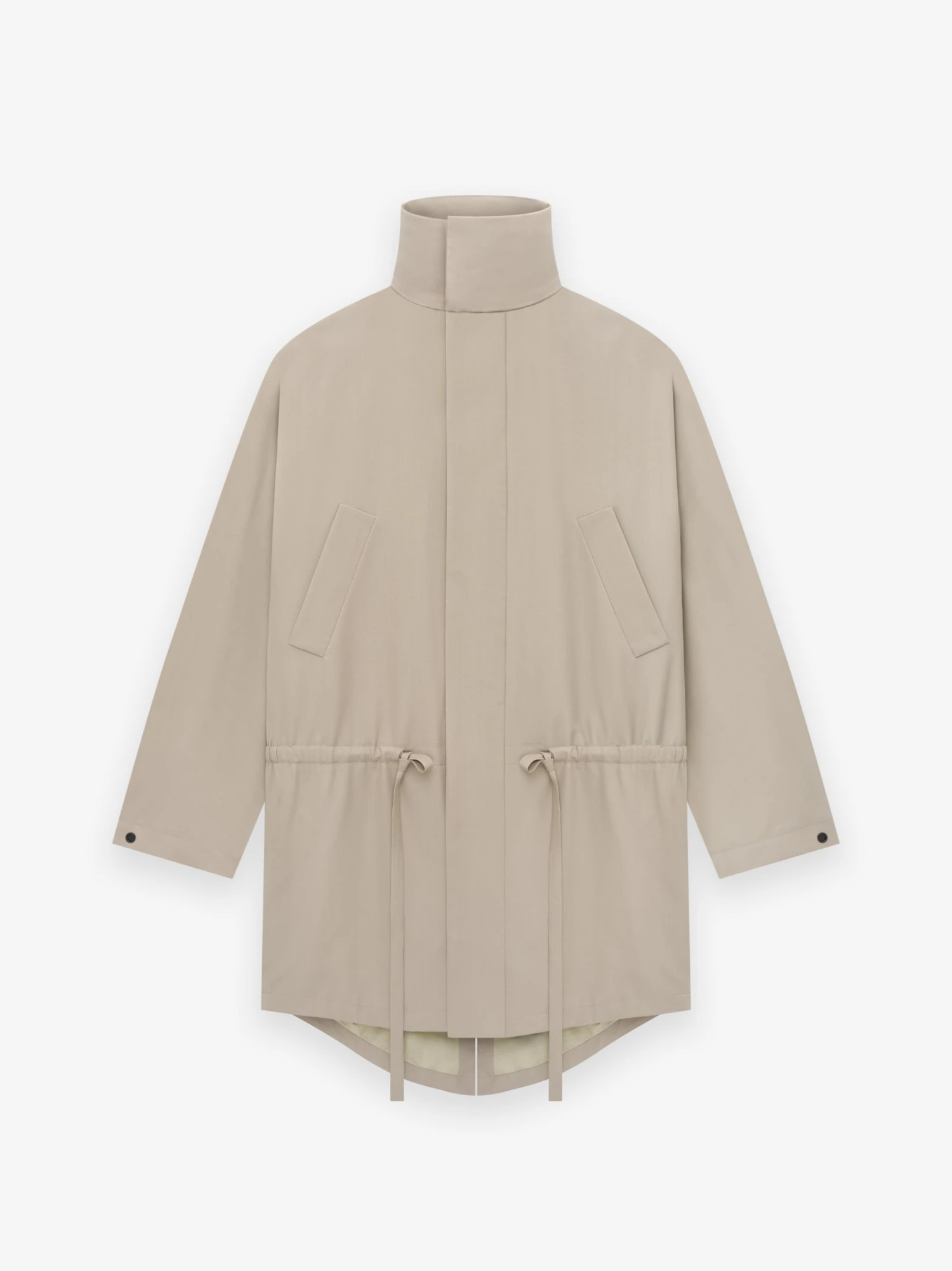 The Eternal Parka is tailored from 100% virgin wool for elegant drape. The fit is relaxed, with dropped shoulders to allow layering. Additional details include a polyester lining, high neck, chest welt pockets, side seam pockets, full zipper closure, metal snap hardware, and a waist belt. A Fear of God label is stitched at the back collar.