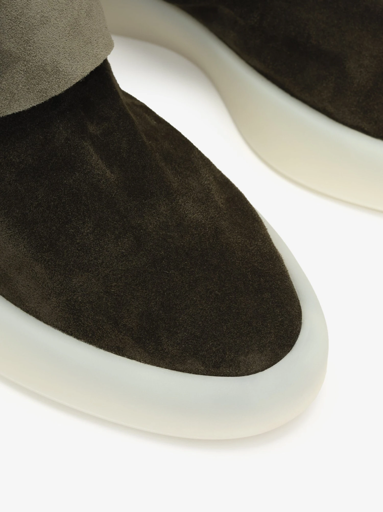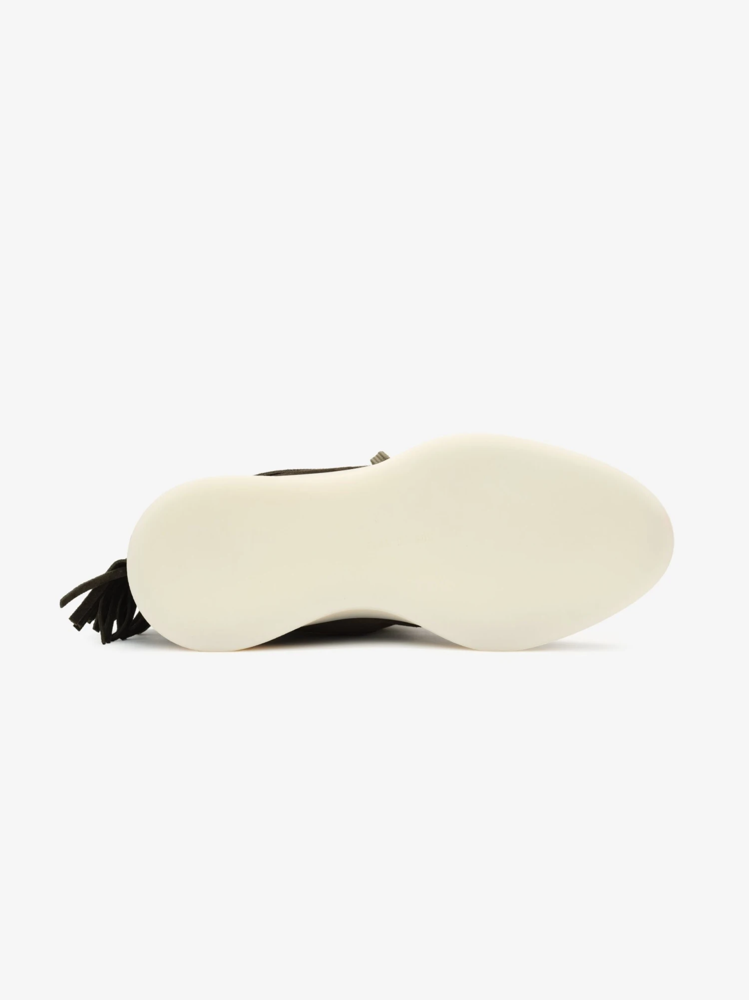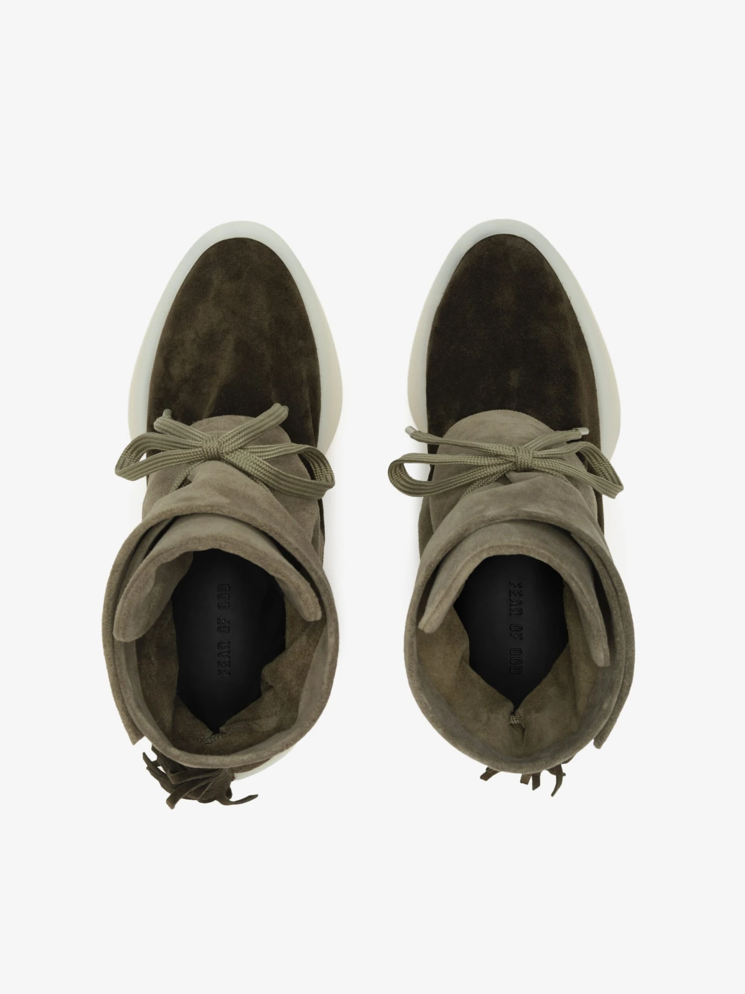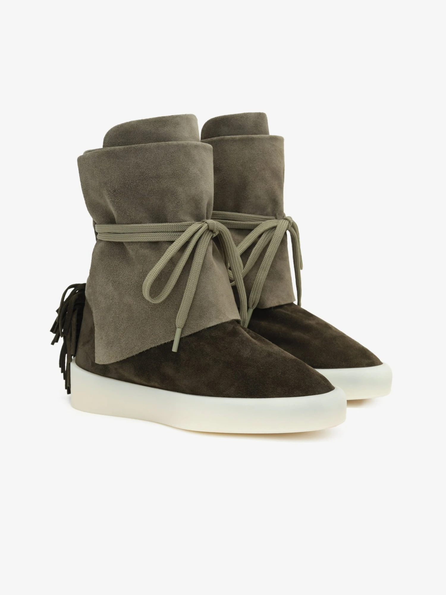 The Yuma Moc is crafted in Italy from soft Italian suede with a rubber moc outsole. The Native American-inspired style is designed with an overlapped suede front, wrapped laces for adjustability, suede fringe and a Fear of God black bar label on the heel.