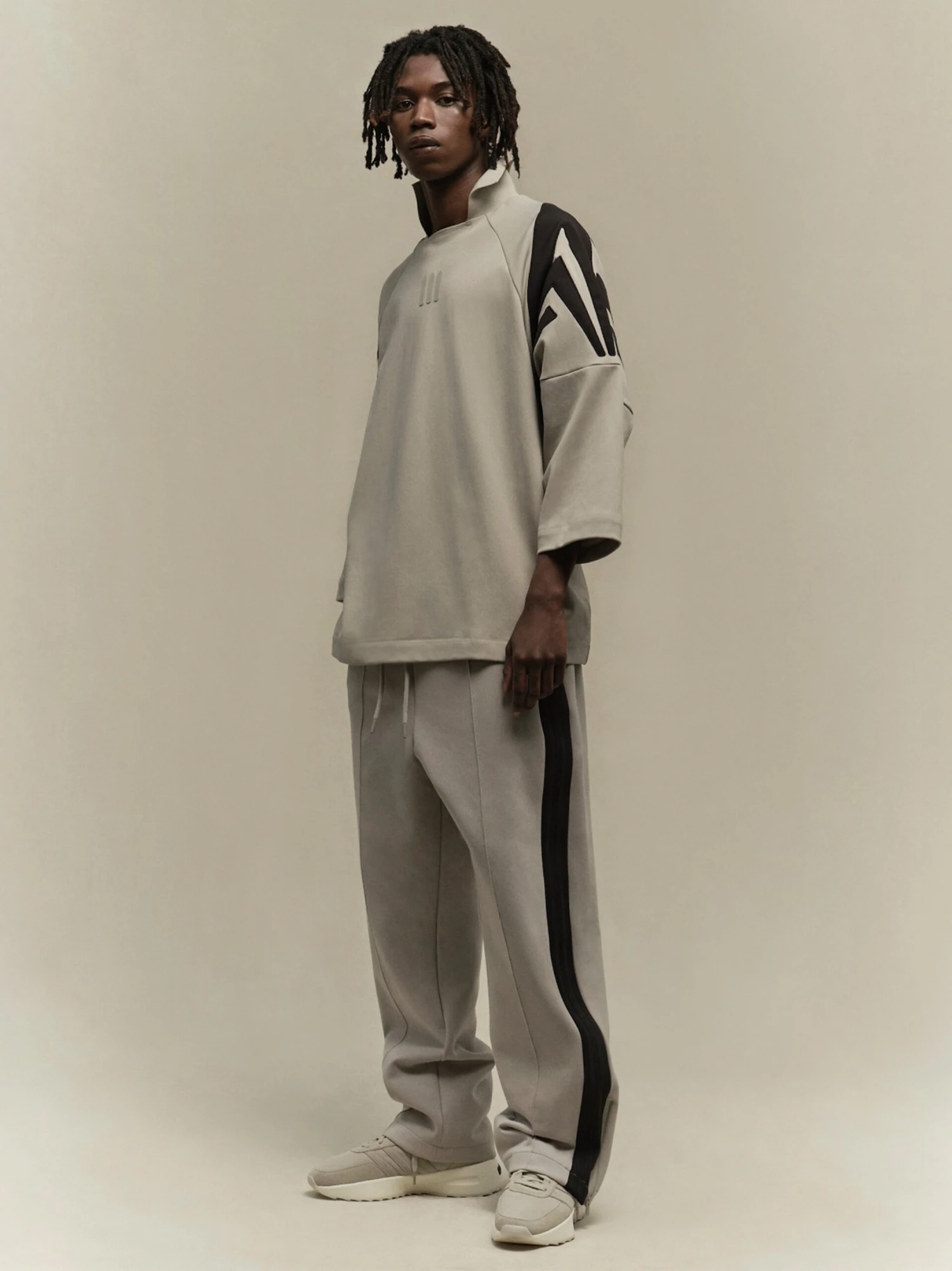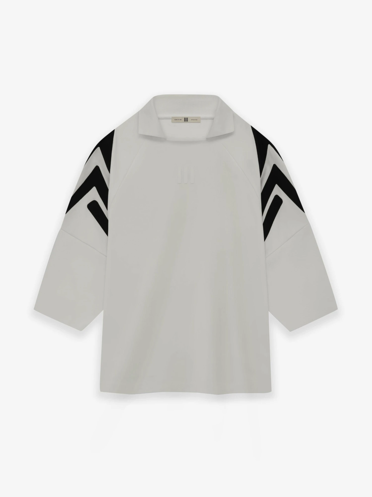 The Fear of God Athletics Goalie Jersey is crafted in a French tricot fabric. The jersey is designed in a relaxed fit with a rib polo collar and iconic stripes on the sleeves inspired from the 1980’s. Minimalist branding is symbolized by a sueded 3-pillars logo on the center front and a sueded black bar label at the back collar.
