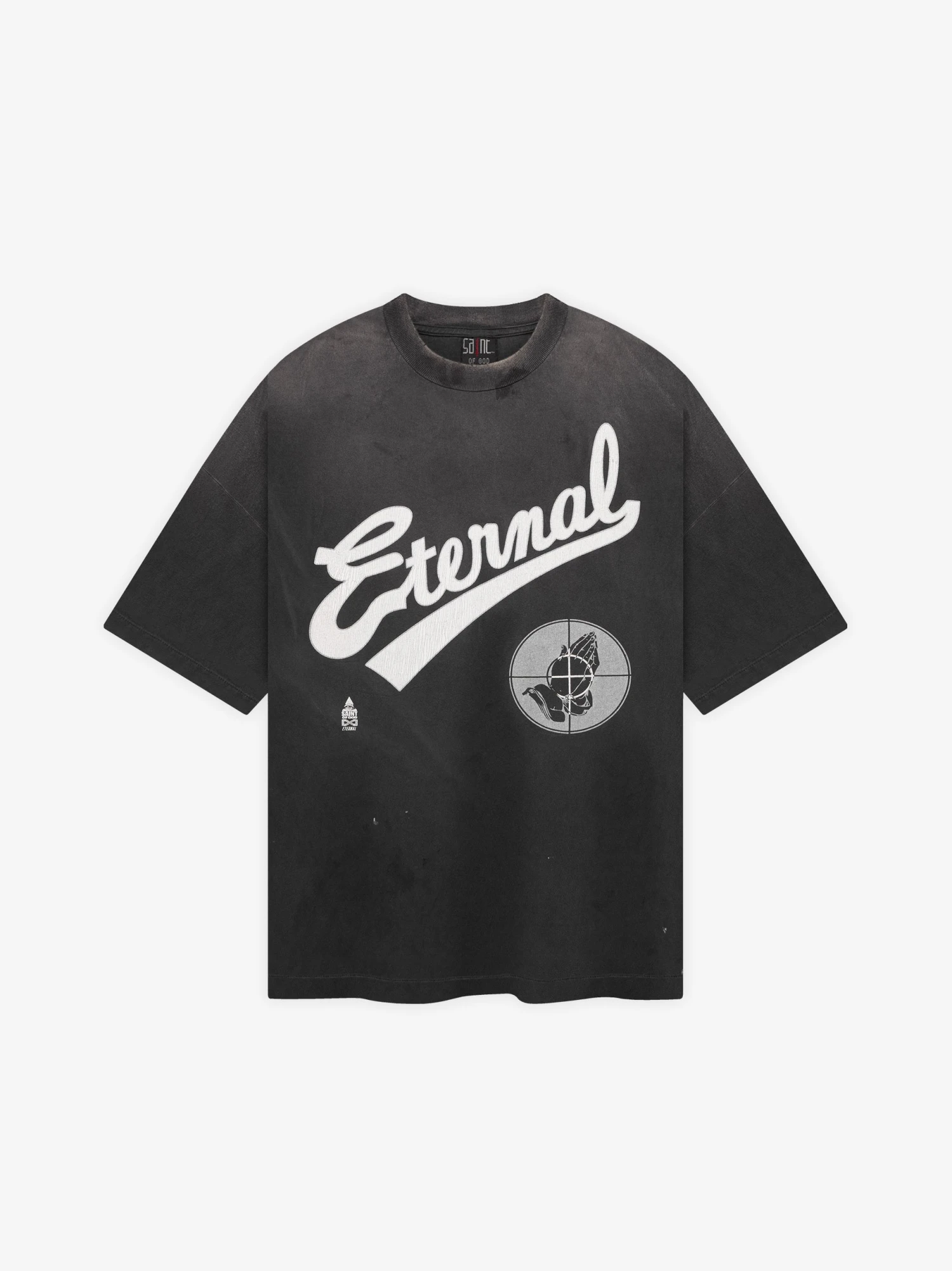 Introducing the new collaboration between ©SAINT Mxxxxxx and Fear of God, uniting SAINT’s signature vintage process with Fear of God’s iconic silhouettes. Available in one size, inspired by the perfect vintage tee. Crafted in Japan from quality cotton jersey, the tee features a hand-distressed, sun-bleached wash, complemented by bold graphics on the front, back. The one-size design offers a voluminous fit for a stylish drape and is exceptionally elongated in length, making it suitable for a range of heights.
