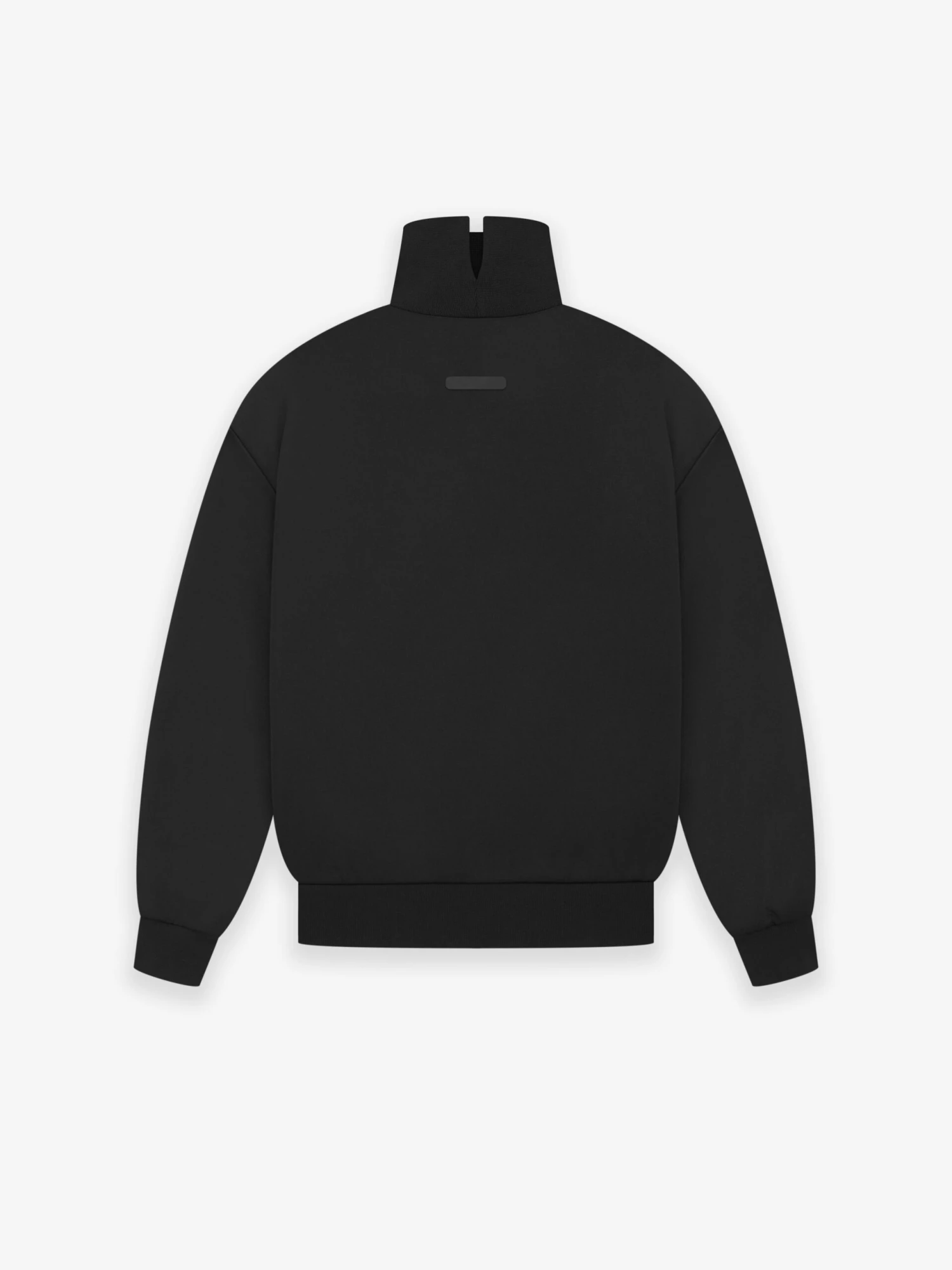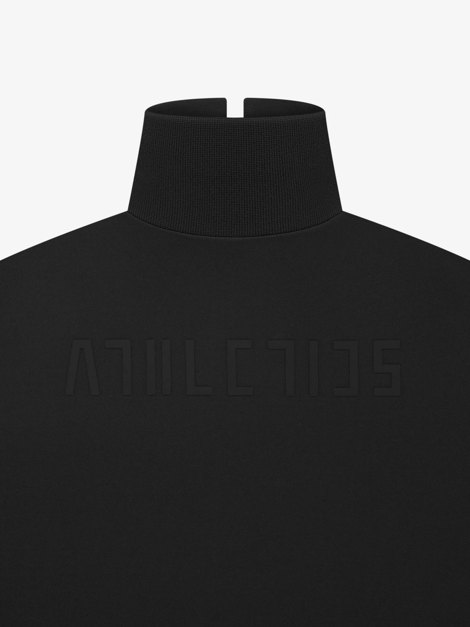 The Fear of God Athletics Mockneck Pullover is elevated in a heavy tricot to provide structure with a shiny pique texture. The women’s mockneck is designed with voluminous proportions in the body and sleeves. Functional details include side seam pockets with a perforated 4-way stretch lining, and an elastic binding frames the mockneck, with rib-knit cuffs, and waist hem. Branding is illustrated in the sueded Athletics logo on the center front and a sueded black bar label at the back collar.